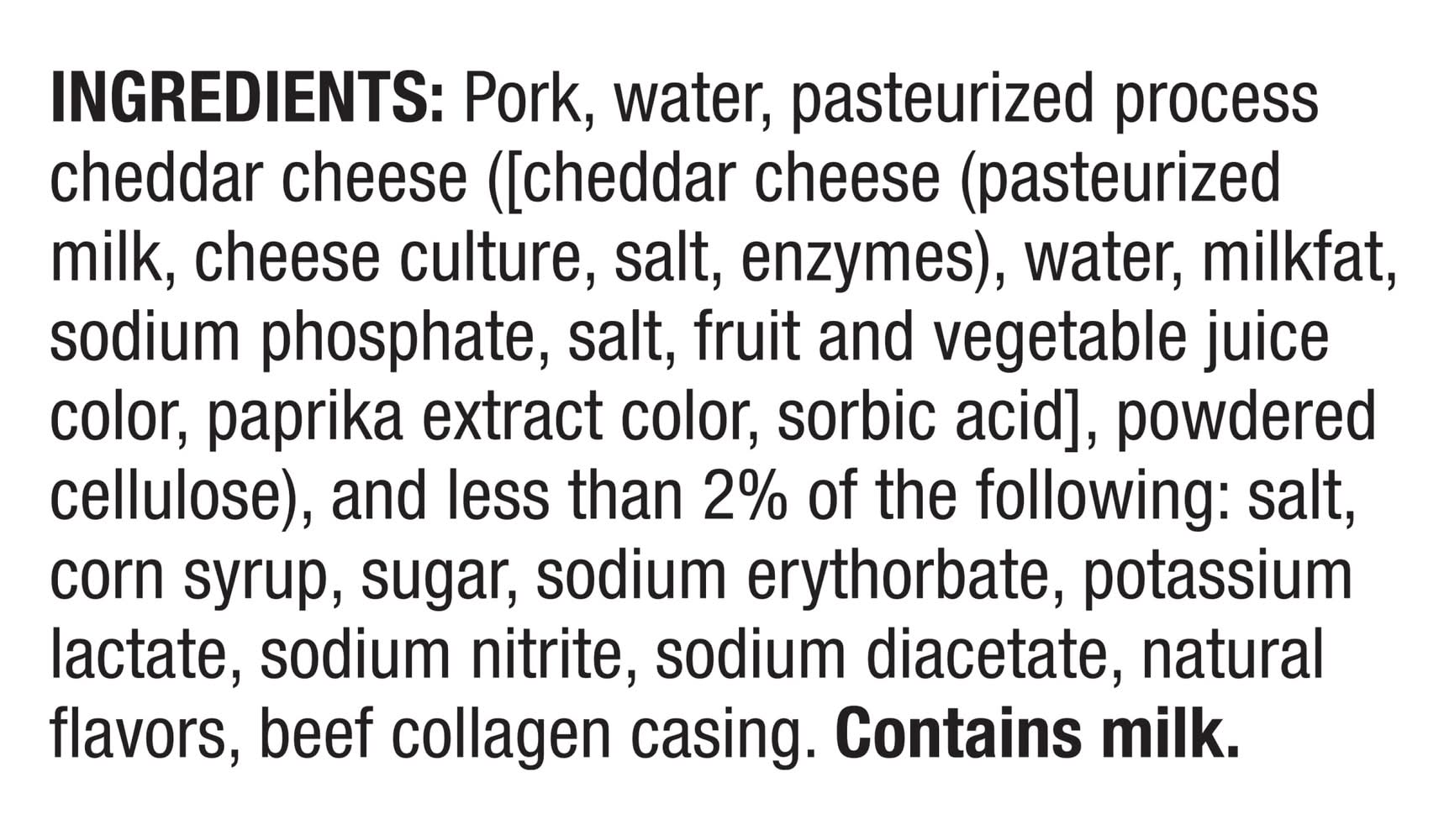 Ingredients: Ingredients: Pork, water, pasteurized process cheddar cheese ([cheddar cheese (pasteurized milk, cheese culture, salt, enzymes), water, milkfat, sodium phosphate, salt, fruit and vegetable juice color, paprika extract color, sorbic acid], powdered cellulose), and less than 2% of the following: salt, corn syrup, potassium lactate, sugar, natural flavors, sodium diacetate, sodium erythorbate, sodium nitrite, beef collagen casing. Contains milk. Contains: Milk