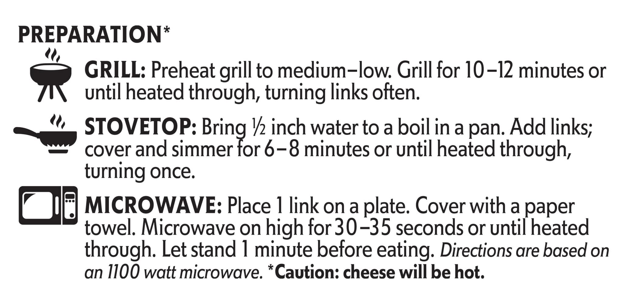 Directions for use: Directions: Fully cooked. Preparation: (Caution: Cheese will be hot). Grill: Preheat grill to medium-low. Grill for 10-12 minutes or until heated through, turning links often. Stovetop: Bring 1/2 inch water to a boil in a pan. Add link; cover and simmer for 6-8 minutes or until heated through turning once. Microwave: Place 1 link on a plate. Cover with paper towel. Microwave on high for 30-35 seconds or until heated through. Let stand 1 minute before eating. Direction are on an 1100 watt microwave. Keep refrigerated. Storage & Handling: For optimum freshness, keep refrigerated and use by the date of stamped on the package or freeze no longer than 30 days. Open packages should be consumed within 7 days. Storage recommendation: Keep refrigerated. Storage & Handling: For optimum freshness, keep refrigerated and use by the date of stamped on the package or freeze no longer than 30 days. Open packages should be consumed within 7 days.