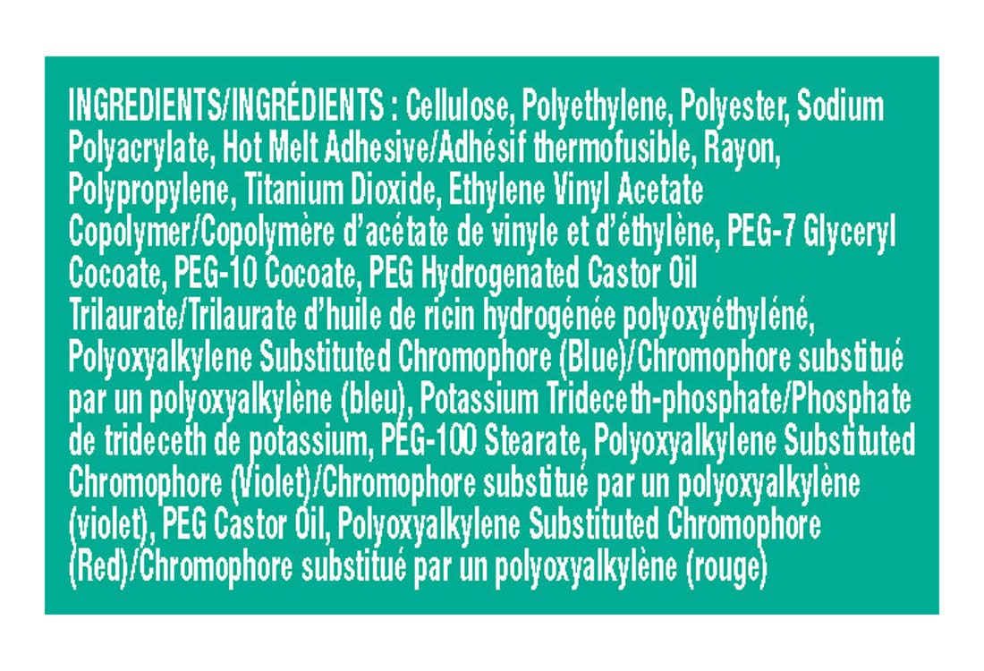 Ingredients: Cellulose, Polyethylene, Polyester, Sodium Polyacrylate, Hot Melt Adhesive/Adhesif Thermofusible, Rayon, Polypropylene, Titanium Dioxide, Ethylene Vinyl Acetate Copolymer/Copolymere D'acetate De Vinyle Et D'ethylene, PEG-7 Glyceryl Cocoate, PEG-10 Cocoate, PEG Hydrogenated Castor Oil Trilaurate/Trilaurate D'huile De Ricin Hydrogenee Polyoxyethylene, Polyoxyalkylene Substituted Chromophore (Blue)/Chromophore Substitute Par Un Polyoxyalkylene (Bleu), Potassium Trideceth-Phosphate/Phosphate De Trideceth De Potassium, PEG-100 Stearate, Polyoxyalkylene Substituted Chromophore (Violet)/Chromophore Substitute Par Un Polyoxyalkylene (Violet), PEG Castor Oil, Polyoxyalkylene Substituted Chromophore Red)/Chromophore Substituted Par Un Polyoxyalkylene (Rouge)