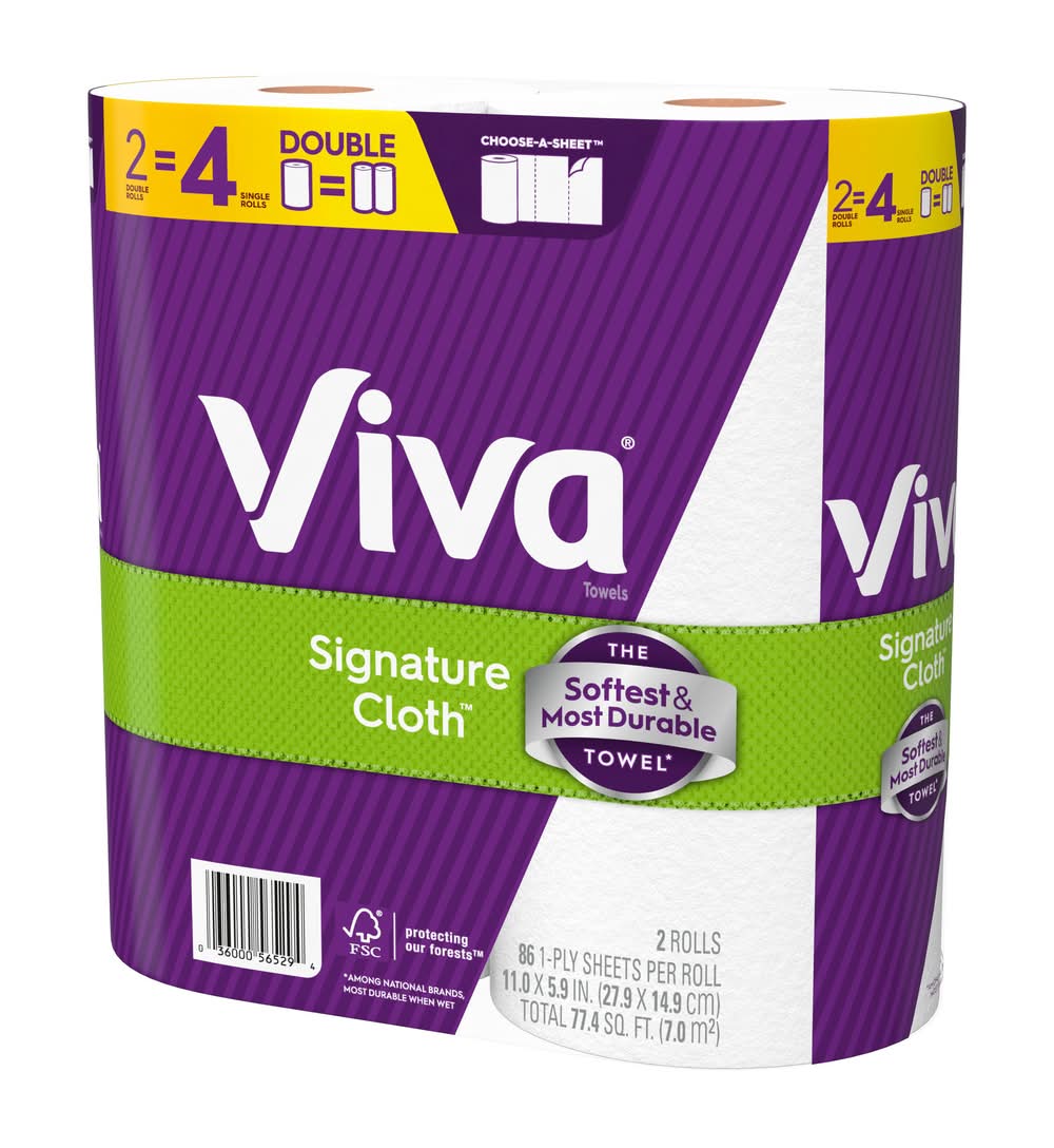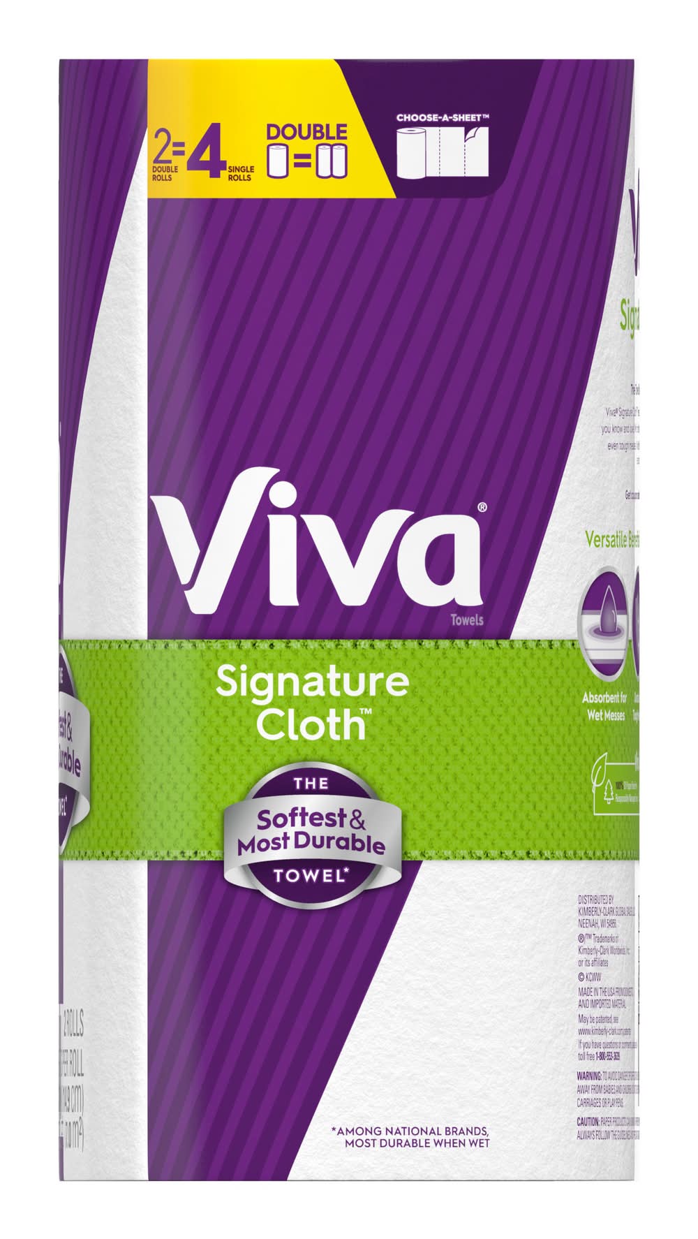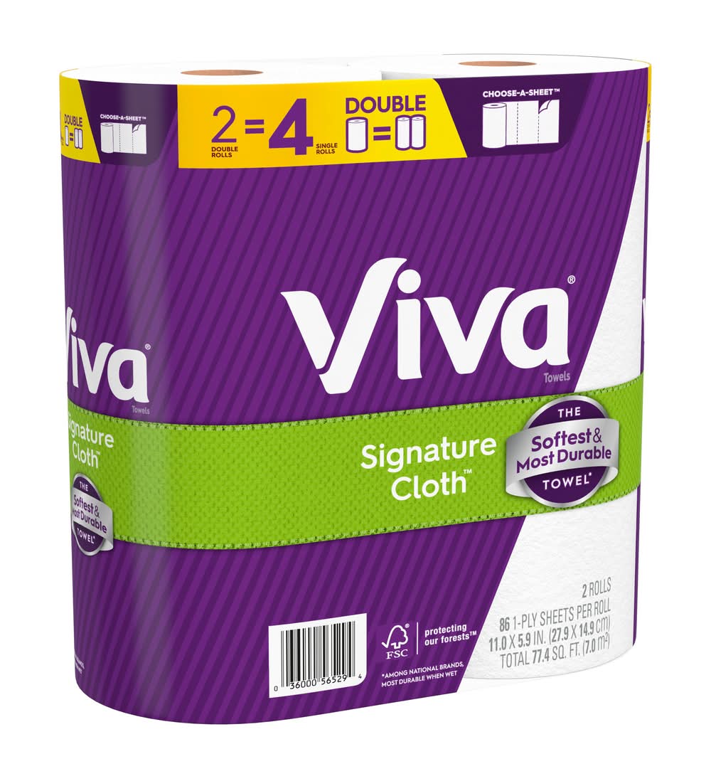 Viva Signature Cloth Paper Towels, 2 Double Rolls, 86 Sheets per Roll • Color: White • Size: 11x5.9 in • Kimberly Clark Global Sales, Llc Neemah, Wi 54956 Trademarks Of Kimberly-clark Worldwide. • Packaging: Reusable