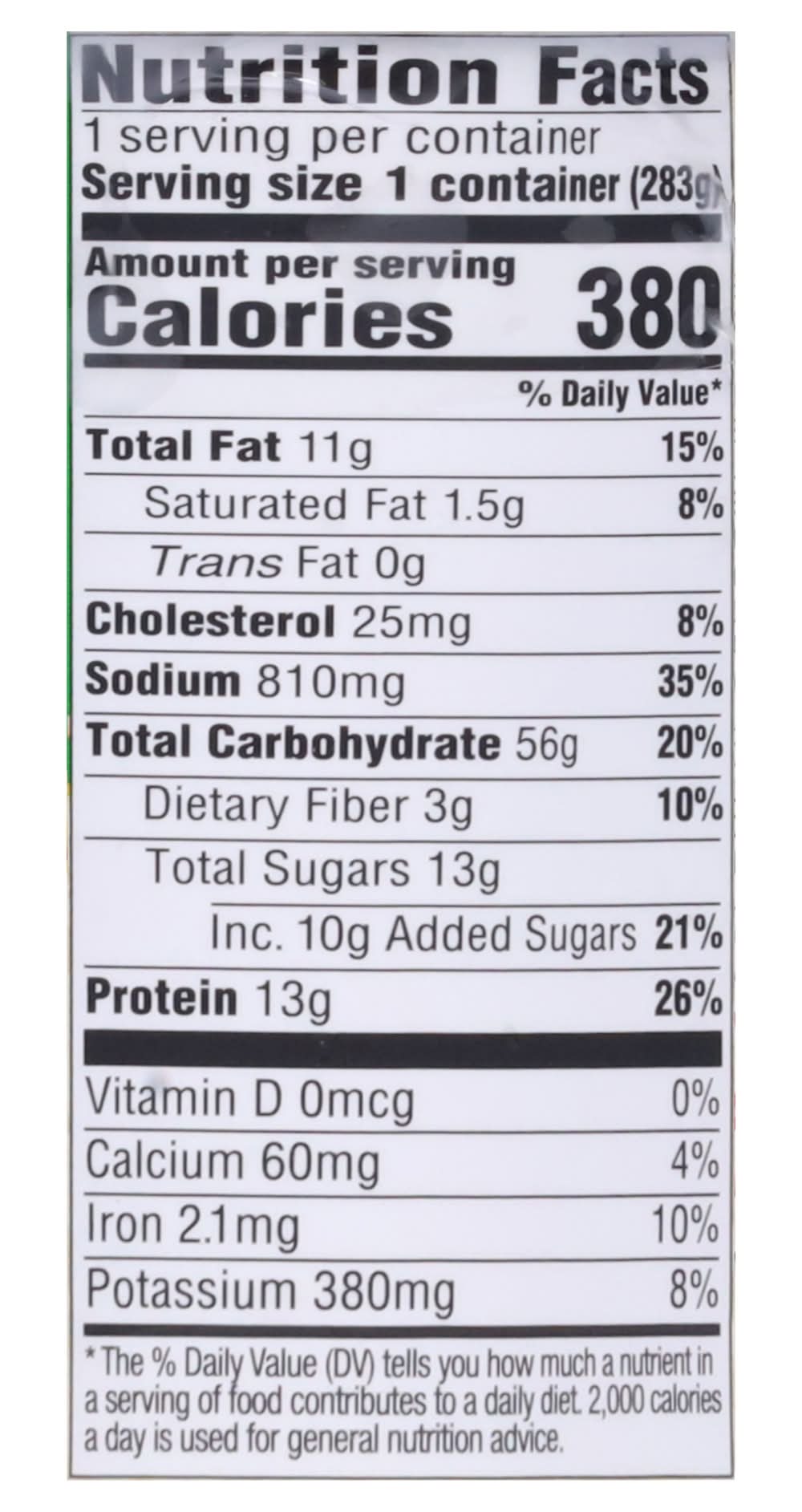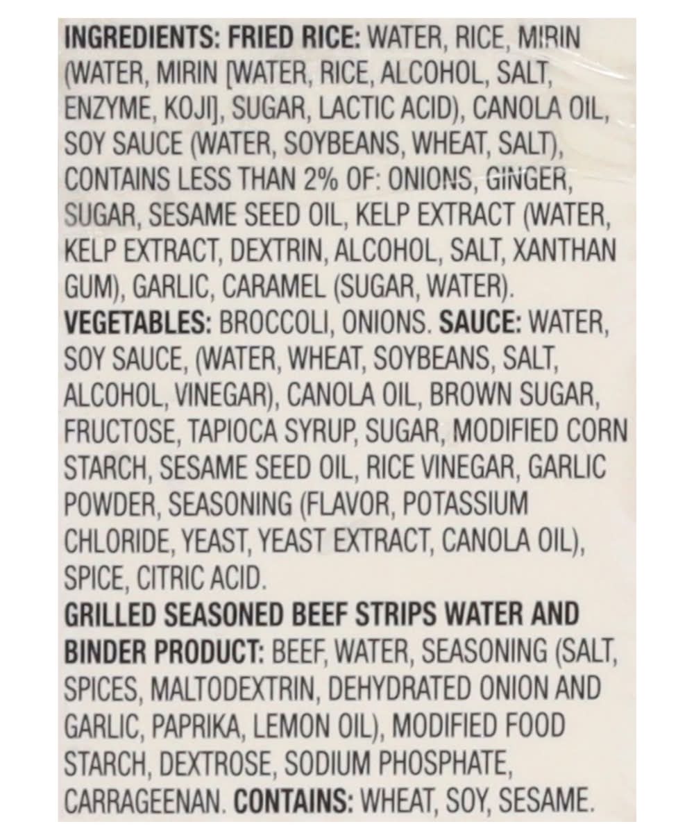 Ingredients: Fried Rice: Water, Rice, Mirin (Water, Mirin [Water, Rice, Alcohol, Salt, Enzyme, Koji, Sugar, Lactic Acid), Canola Oil, Soy Sauce (Water, Soybeans, Wheat, Salt), Contains Less than 2% of: Onions, Ginger, Sugar, Sesame Seed Oil, Kelp Extract (Water, Kelp Extract, Dextrin, Alcohol, Salt, Xanthan Gum), Garlic, Caramel (Sugar, Water), Vegetables: Broccoli, Onions, Sauce: Water, Soy Sauce, (Water, Wheat, Soybeans, Salt, Alcohol, Vinegar), Canola Oil, Brown Sugar, Fructose, Tapioca Syrup, Sugar, Modified Corn Starch, Sesame Seed Oil, Rice Vinegar, Garlic Powder, Seasoning (Flavor, Potassium Chloride, Yeast, Yeast Extract, Canola Oil), Spice, Citric Acid, Grilled Seasoned Beef Strips Water and Binder Product: Beef, Water, Seasoning (Salt, Spices, Maltodextrin, Dehydrated Onion and Garlic, Paprika, Lemon Oil), Modified Food Starch, Dextrose, Sodium Phosphate, Carrageenan Contains: Wheat, Soybeans, Sesame, Corn