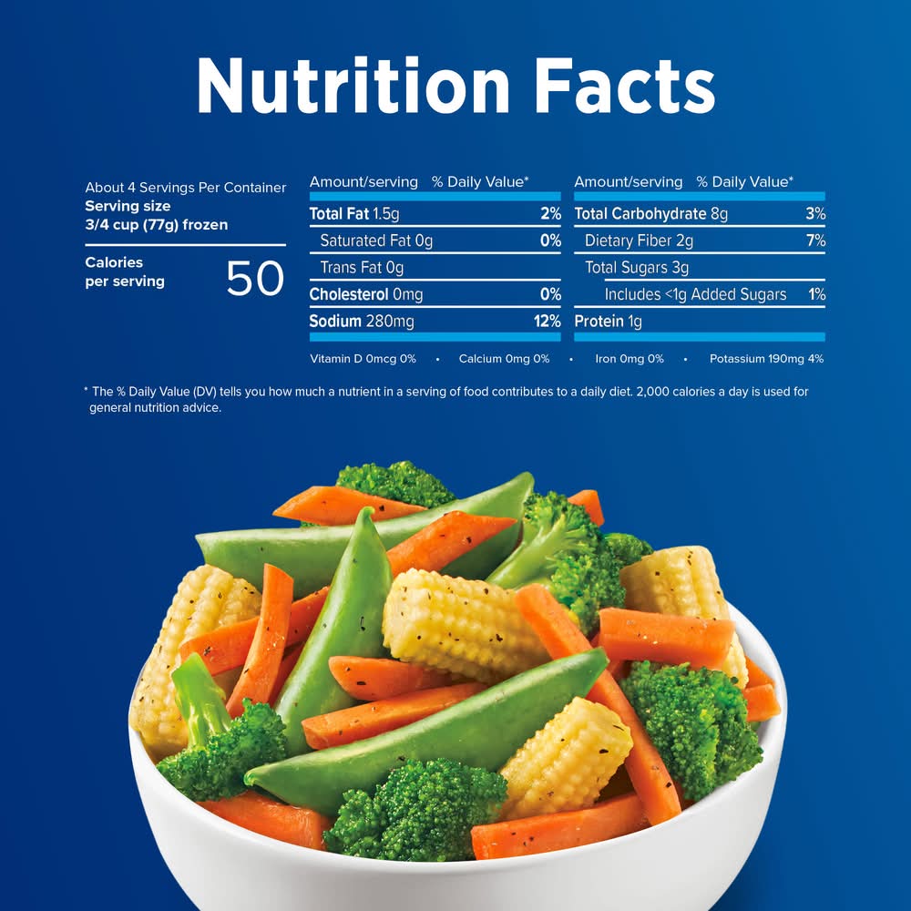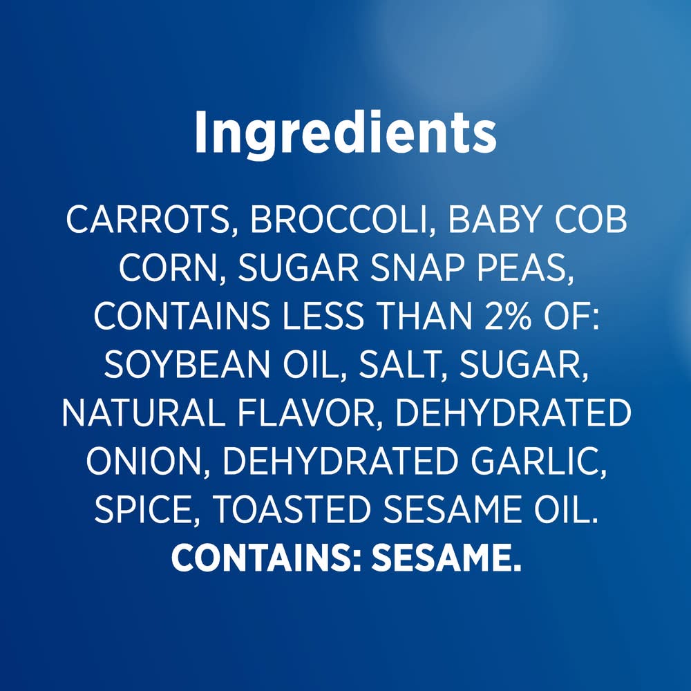 Ingredients: Carrots, Broccoli, Baby Cob Corn, Sugar Snap Peas, Contains Less than 2% of: Soybean Oil, Salt, Sugar, Natural Flavor, Dehydrated Onion, Dehydrated Garlic, Black Pepper, Toasted Sesame Oil Contains: Soy, Sesame