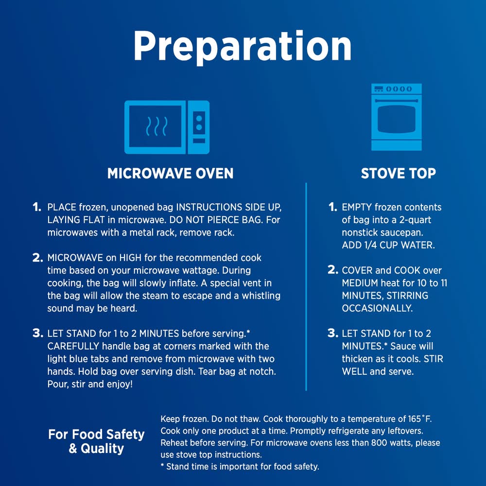 Directions for use: Stovetop Instructions: 1. Empty frozen contents of bag into a 2-quart nonstick sauce pan. Add 1/4 cup water. 2. Cover and cook over medium heat for 10 to 11 minutes, stirring occasionally. 3. Let stand for 1 to 2 minutes (Stand time is important for food safety). Sauce will thicken as it cools. Stir well and serve. Microwave Instructions: Microwave ovens vary - adjust cooking times as needed to reach 165 degrees F as measured by a food thermometer taken in several spots. 1. Place frozen, unopened bag this side up, laying flat in microwave. Do not pierce bag. For microwaves with a metal rack, remove rack. 2. Microwave on high for the recommended cook time based on your microwave wattage. During cooking, the bag will slowly inflate. A special vent in the bag will allow the steam to escape and a whistling sound may be heard. 3. Let stand for 1 to 2 minutes before serving (Stand time is important for food safety). Carefully handle bag at corners marked with the light blue tabs and remove from microwave with two hands. Hold bag over serving dish. Tear bag at notch. Pour, stir and enjoy! Microwave Cook Time: Wattage: 1200; Minutes: 5-1/2. Wattage: 1000; Minutes: 6. Wattage: 800; Minutes: 7. For microwave ovens less than 800 watts, please use stovetop cooking instructions. Cook thoroughly to a temperature of 165 degrees F. Cook only one product at a time. Promptly refrigerate any leftovers. Reheat before serving. Storage recommendation: Keep frozen - do not thaw.