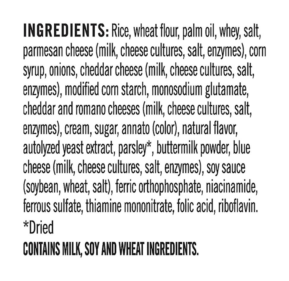 Ingredients: Rice, Wheat Flour, Palm Oil, Whey, Salt, Parmesan Cheese (Milk, Cheese Cultures, Salt, Enzymes), Corn Syrup, Onions, Cheddar Cheese (Milk, Cheese Cultures, Salt, Enzymes), Modified Corn Starch, Monosodium Glutamate, Cheddar and Romano Cheeses (Milk, Cheese Cultures, Salt, Enzymes), Cream, Sugar, Annato (Color), Natural Flavor, Autolyzed Yeast Extract, Parsley*, Buttermilk Powder, Blue Cheese (Milk, Cheese Cultures, Salt, Enzymes), Soy Sauce (Soybean, Wheat, Salt), Ferric Orthophosphate, Niacinamide, Ferrous Sulfate, Thiamine Mononitrate, Folic Acid, Riboflavin. *Dried Contains: Milk, Soybeans, Wheat