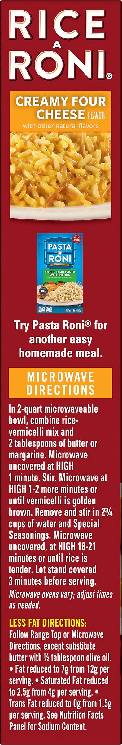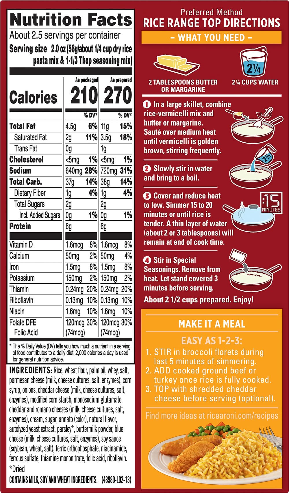 Preferred method rice range top directions what you need 2 tablespoons butter or margarine 2 1/4 cups water 1. in a large skillet, combine rice-vermicelli mix and butter or margarine. sauté over medium heat until vermicelli is golden brown, stirring frequently. 2. slowly stir in water and bring to a boil. 3. cover and reduce heat to low. simmer 15 to 20 minutes or until rice is tender. a thin layer of water (about 2 or 3 tablespoons) will remain at end of cook time. 4. stir in special seasonings. remove from heat. let stand covered 3 minutes before serving. about 2 1/2 cups prepared. enjoy! make it a meal easy as 1-2-3: 1. stir in broccoli florets during last 5 minutes of simmering. 2. add cooked ground beef or turkey once rice is fully cooked. 3. top with shredded cheddar before serving (optional). less fat directions: follow range top or microwave directions, except substitute butter with 1/2 tablespoon olive oil. • fat reduced to 7g from 12g per serving. • saturated fat reduced to 2.5g from 4g per serving. • trans fat reduced to 0g from 1g per serving. see nutrition facts panel for sodium content.