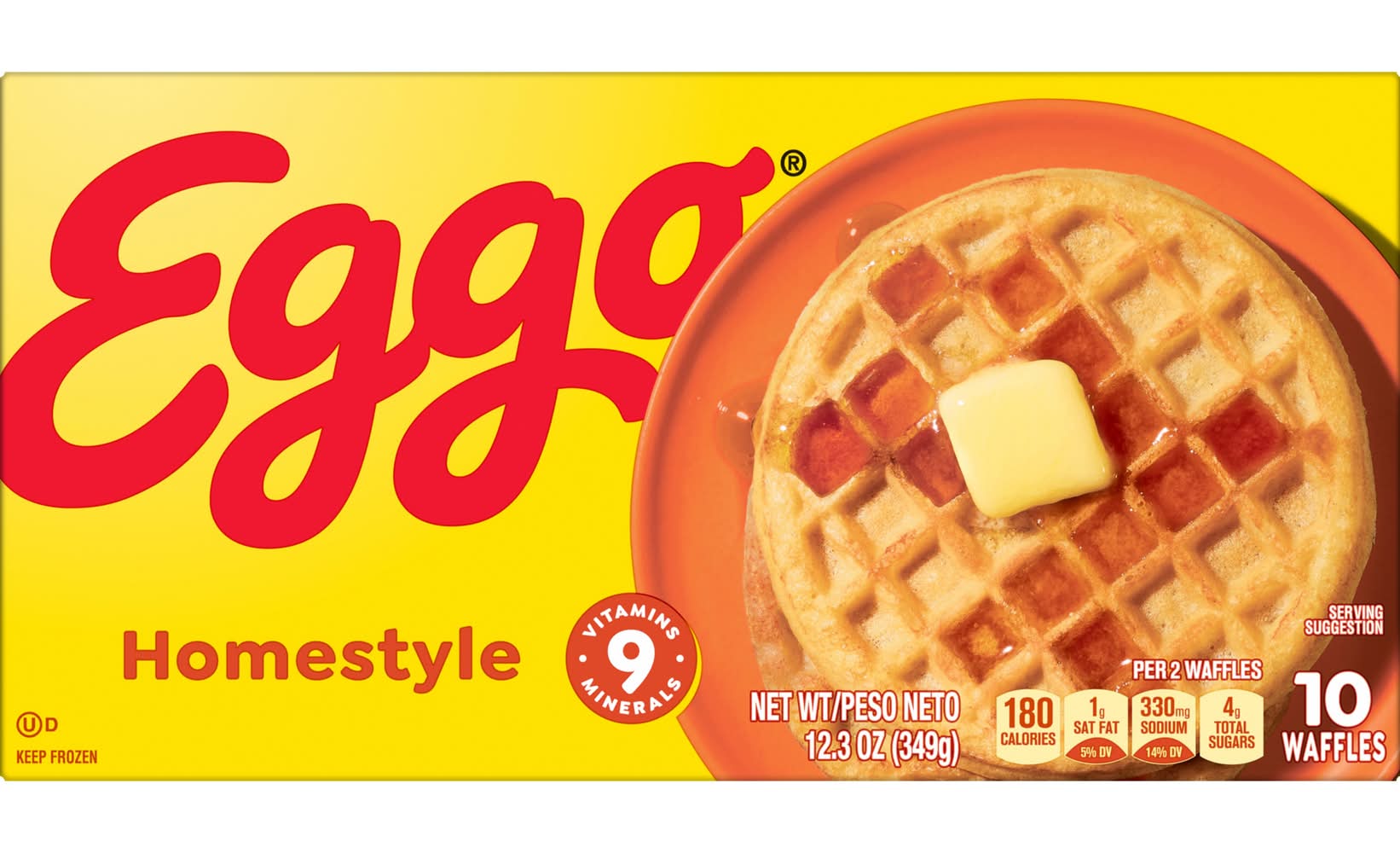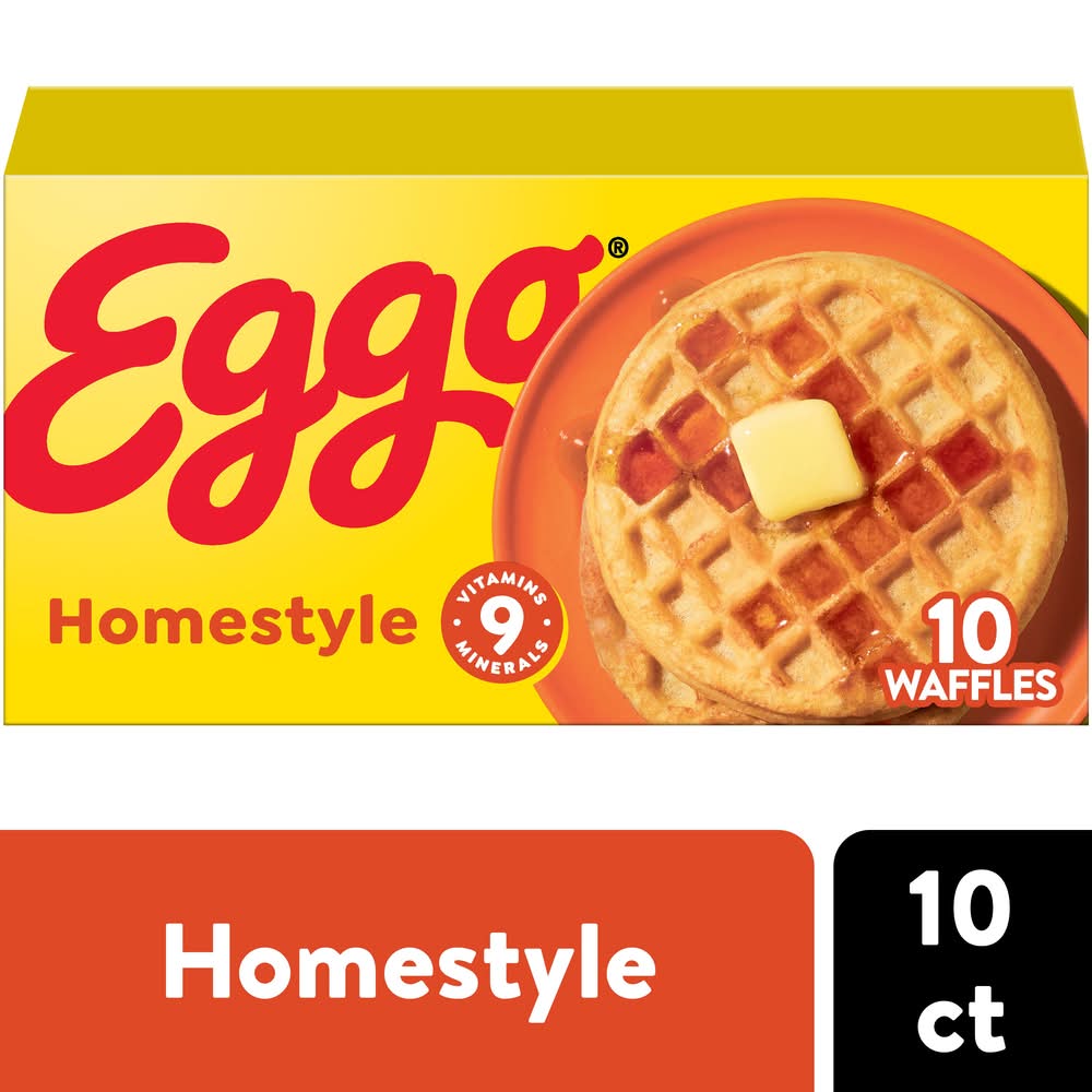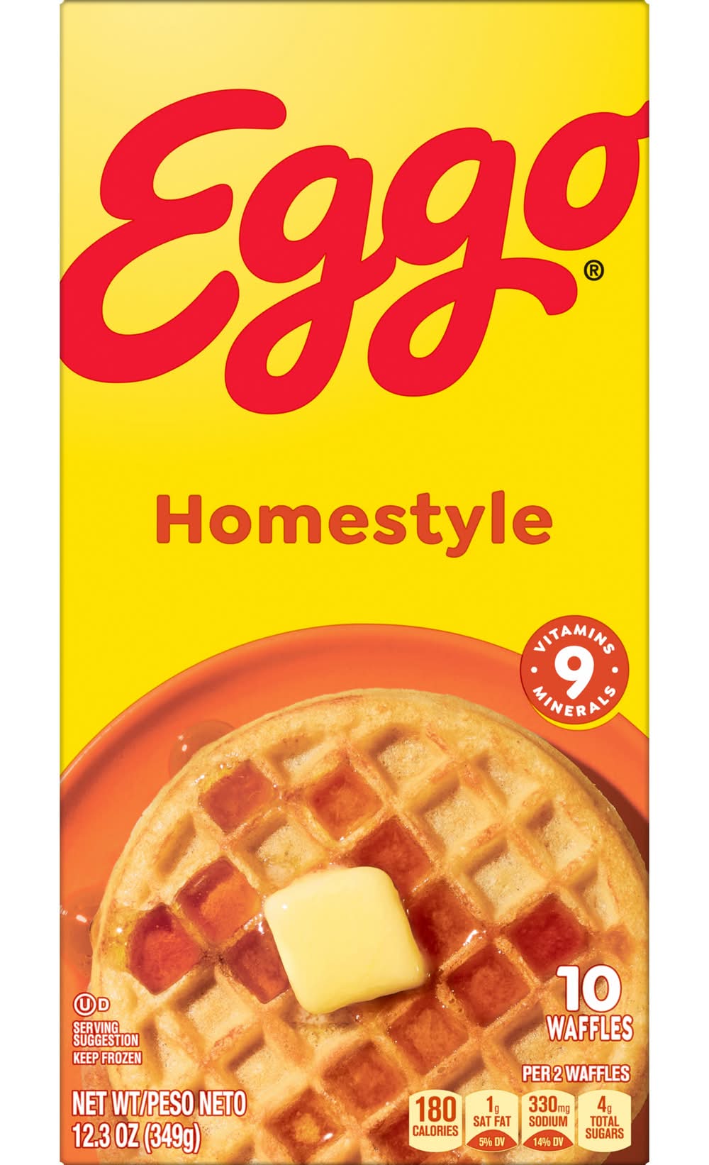 Wake up and greet the day with the feel-good taste of Eggo Homestyle waffles. Deliciously crispy and fluffy, our Eggo Homestyle waffles are crafted with delicious ingredients for a part of a quick and easy breakfast. Pop these frozen waffles in the toaster or oven for a delightfully crisp texture and an inviting, homemade taste. Feel good about what you're serving your family; 2 waffles provide a good source of 9 vitamins and minerals. Conveniently packaged and easy to prepare, Kellogg's Eggo Homestyle waffles help bring warmth and smiles to fast-paced, busy mornings. Great for families and individuals alike, these delicious, rich waffles are made to enjoy as part of a delicious breakfast. Try them with your favorite morning toppings such as butter and syrup, jellies and jam, peanut butter, hazelnut spread, fresh fruit, berries, whipped cream, and powdered sugar. They're just so delicious, would you L'Eggo your Eggo? • Size: 12.3 OZ • Packaging: Reusable