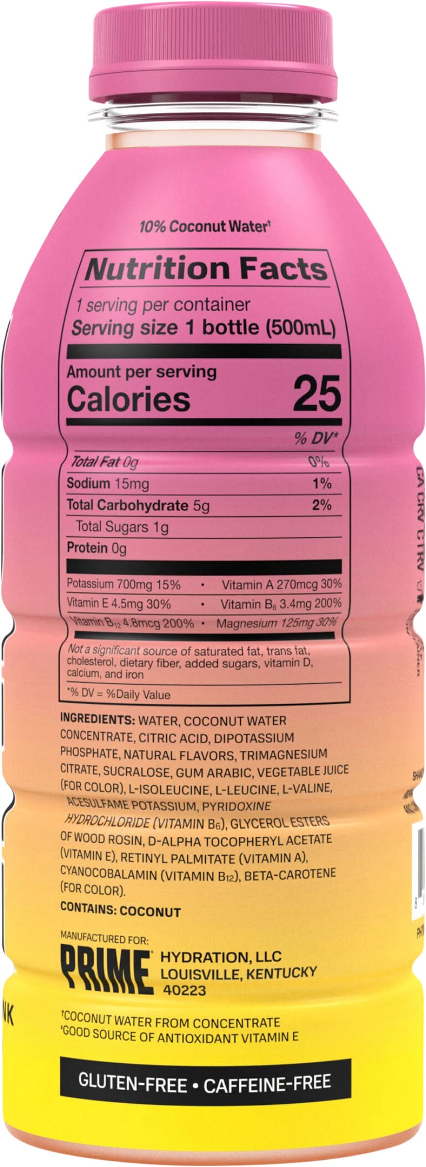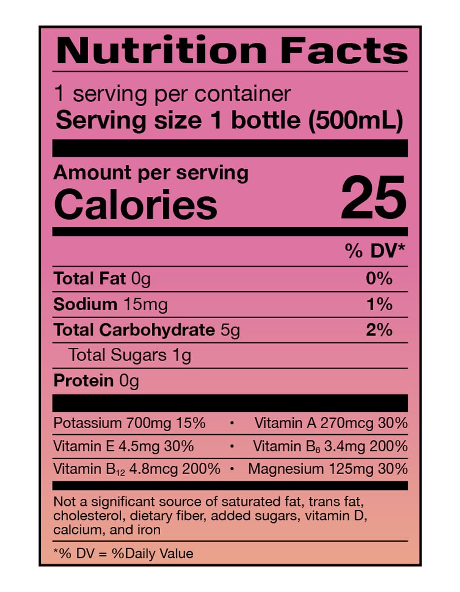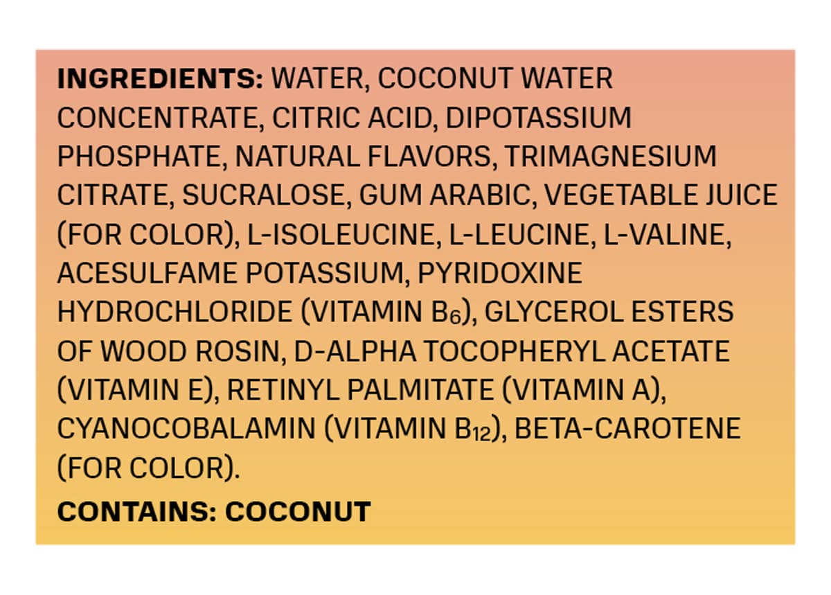 Ingredients: Water, Coconut Water Concentrate, Citric Acid, Dipotassium Phosphate, Natural Flavors, Trimagnesium Citrate, Sucralose, Gum Arabic, Vegetable Juice (for Color), L-Isoleucine, L-Leucine, L-Valine, Acesulfame Potassium, Pyridoxine Hydrochloride (Vitamin B6), Glycerol Esters of Wood Rosin, D-Alpha Tocopheryl Acetate (Vitamin E), Retinyl Palmitate (Vitamin a), Cyanocobalamin (Vitamin B12), Beta-Carotene (for Color) Contains: Tree Nuts, Coconuts