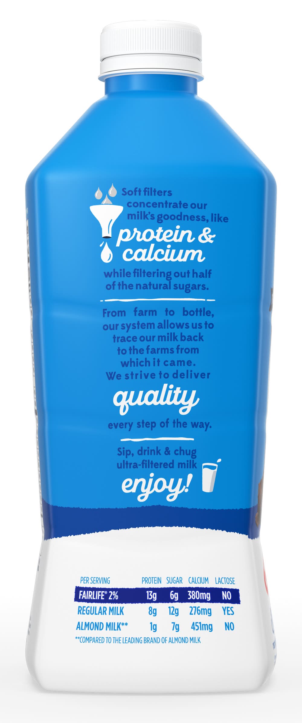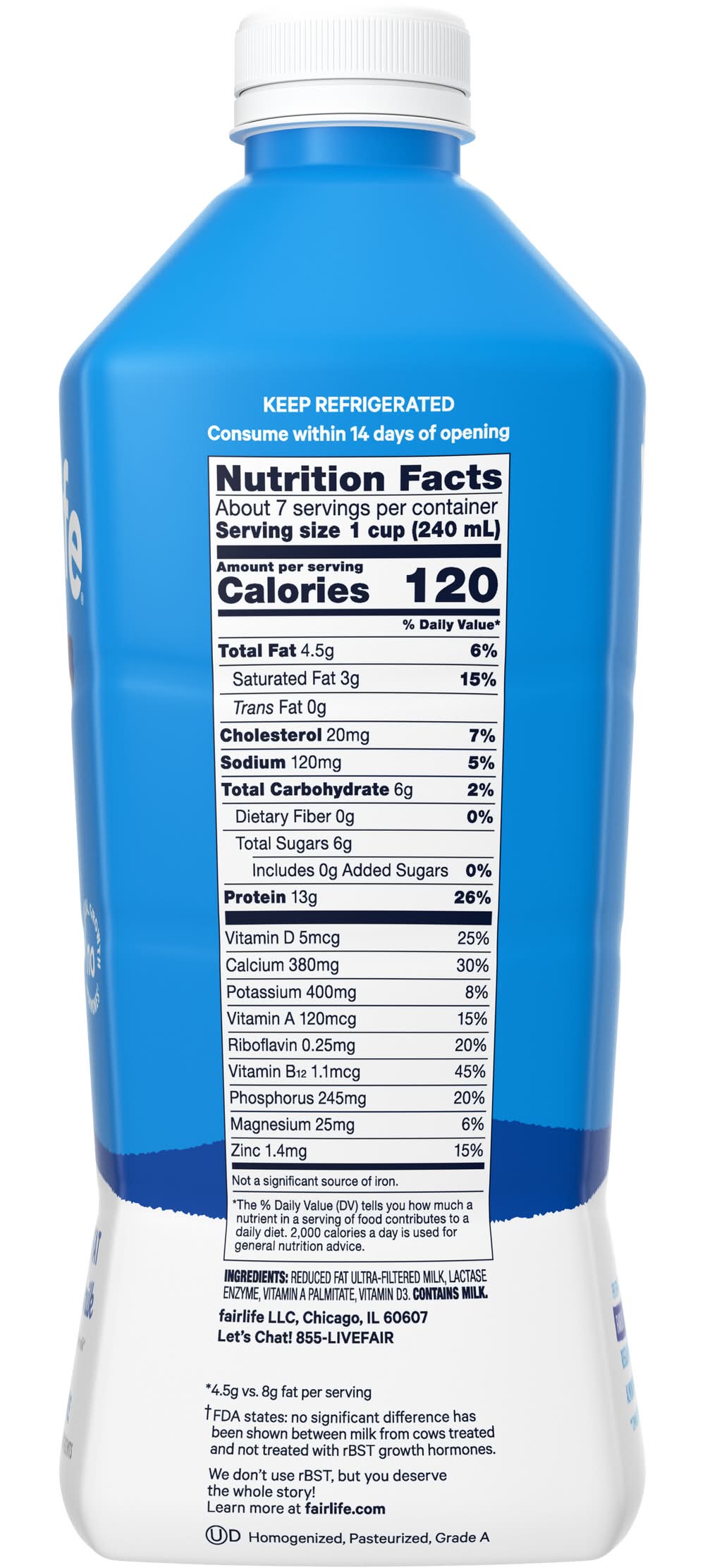 43% less fat than whole ultra-filtered milk No artificial growth hormones Soft filters concentrate our milk's goodness, like protein & calcium while filtering out half of the natural sugars. Sip, drink & chug ultra-filtered milk enjoy! • Size: 52 OZ • Fairlife, Chicago, IL 60607