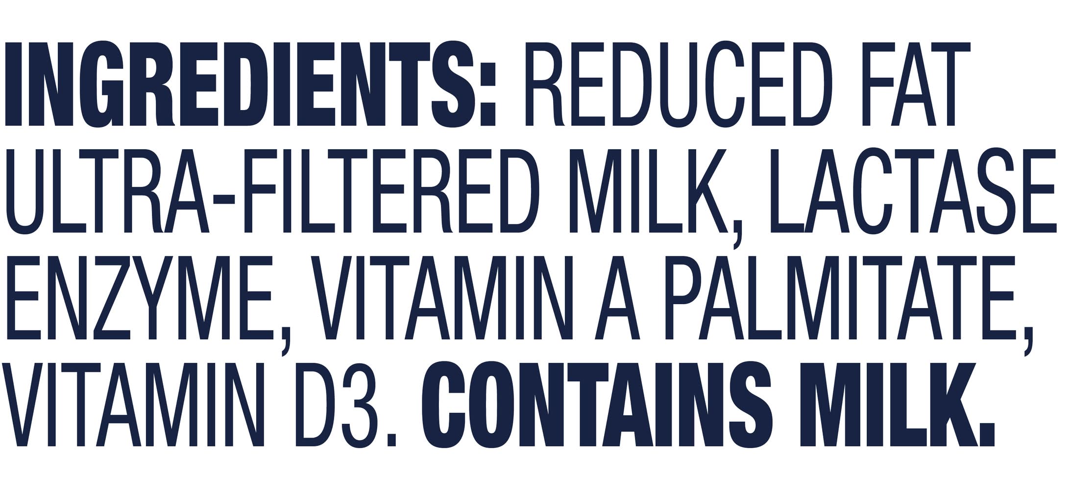 Ingredients: Reduced Fat Ultra-Filtered Milk, Lactase Enzyme, Vitamin A Palmitate, Vitamin D3 Contains: Milk