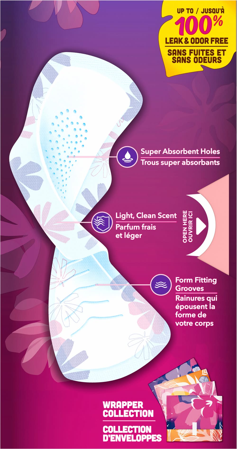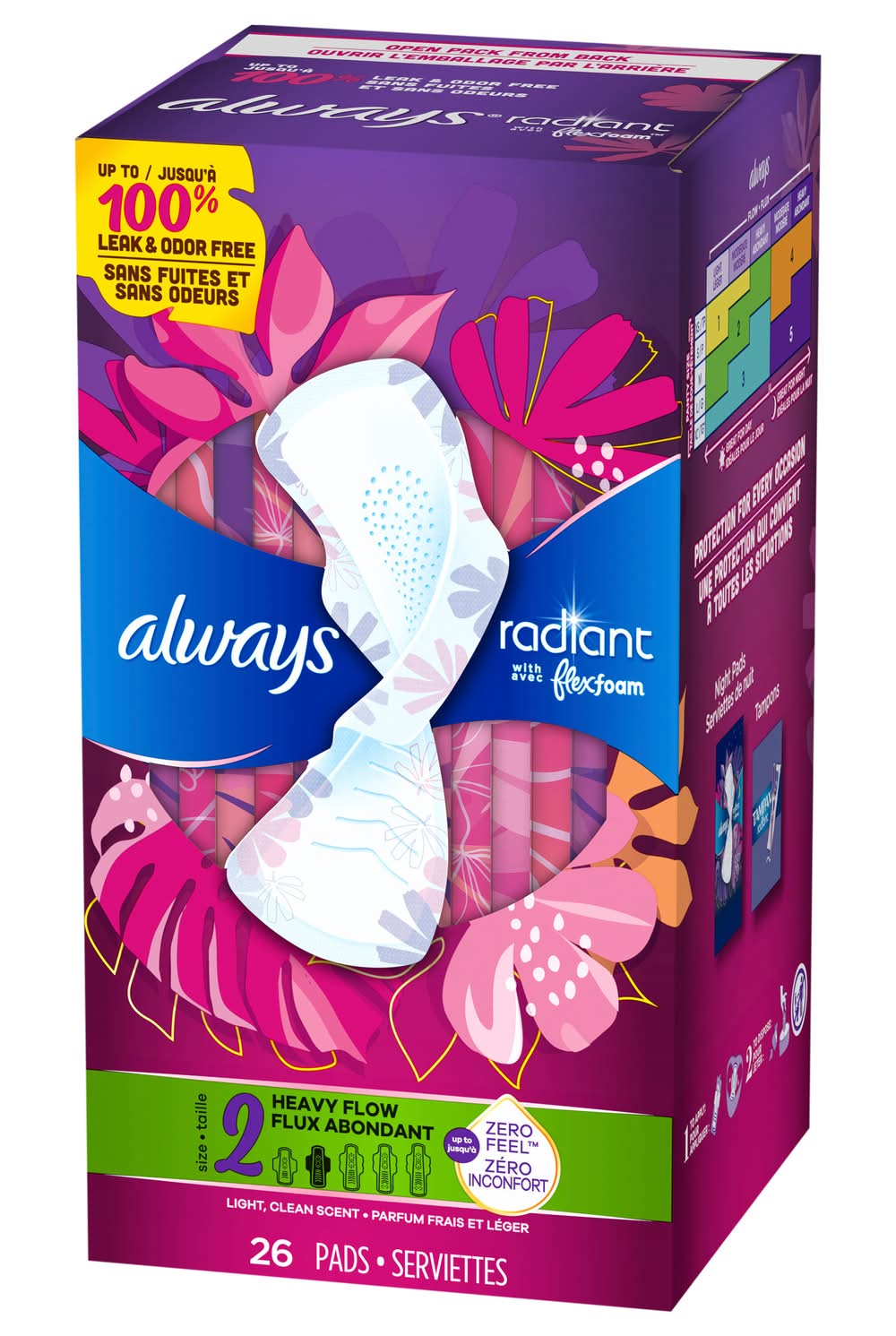 Up to 100% leak & odor free. Radiant with FlexFoam. Flexi-wings. Up to Zero Feel. Freedom to wear what you want. Incredibly thin and absorbent pad is the perfect accessory for even the tightest jeans. Made with form fitting Flex Foam so you barely feel it. Up to 10 hours of leak free, zero feel protection. Neon vibes. Wrapper collection. No compromise guarantee (Satisfaction guaranteed, or your money back. If not satisfied with the performance of Always, send original receipt and UPC within 60 days of purchase for a refund via a prepaid card in the amount of your purchase. • Size: 2 • Procter & Gamble, Cincinnati, OH, 45202 • Packaging: Reusable