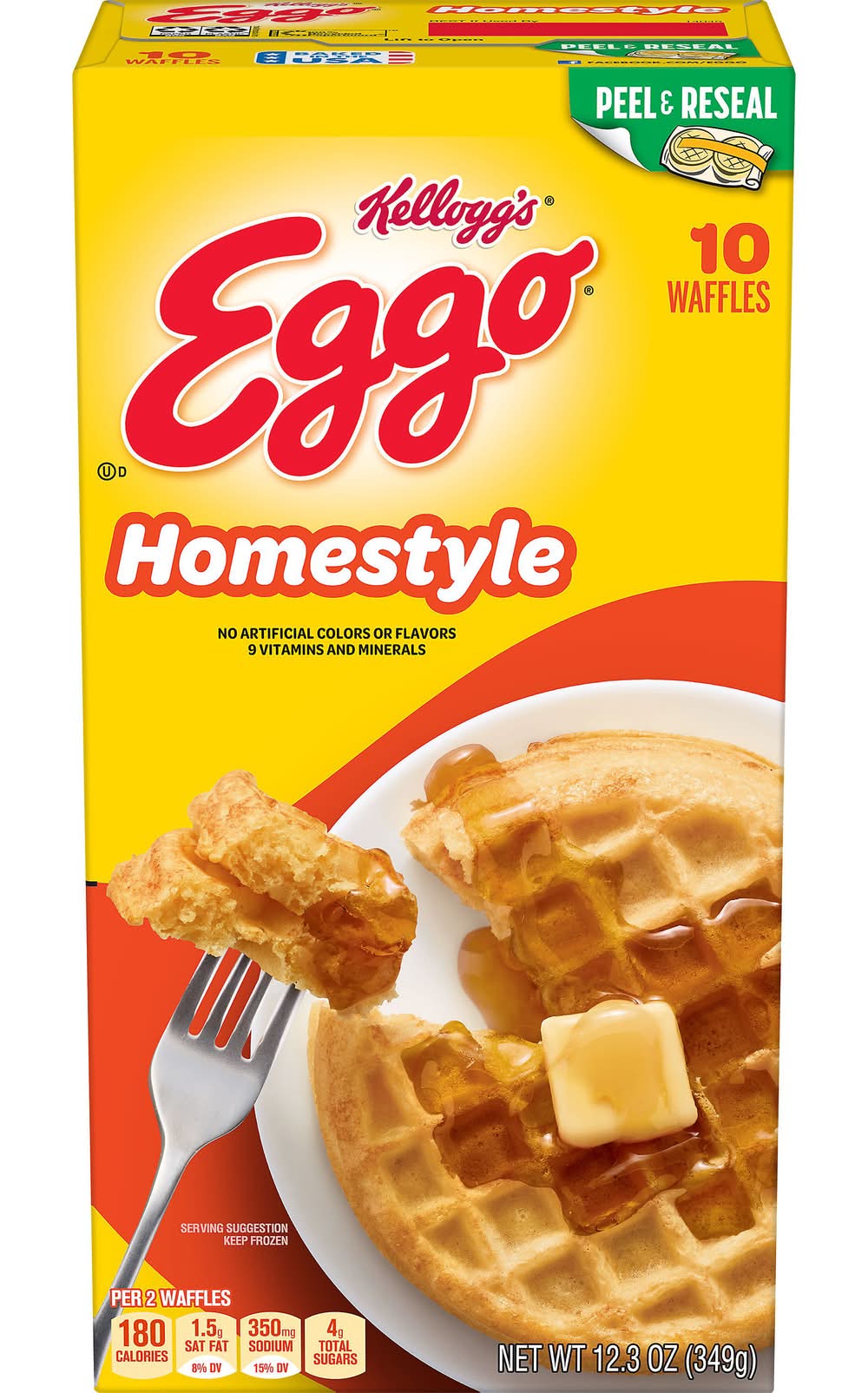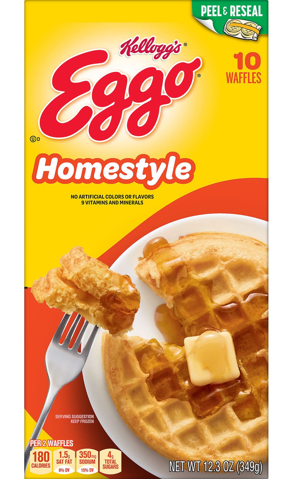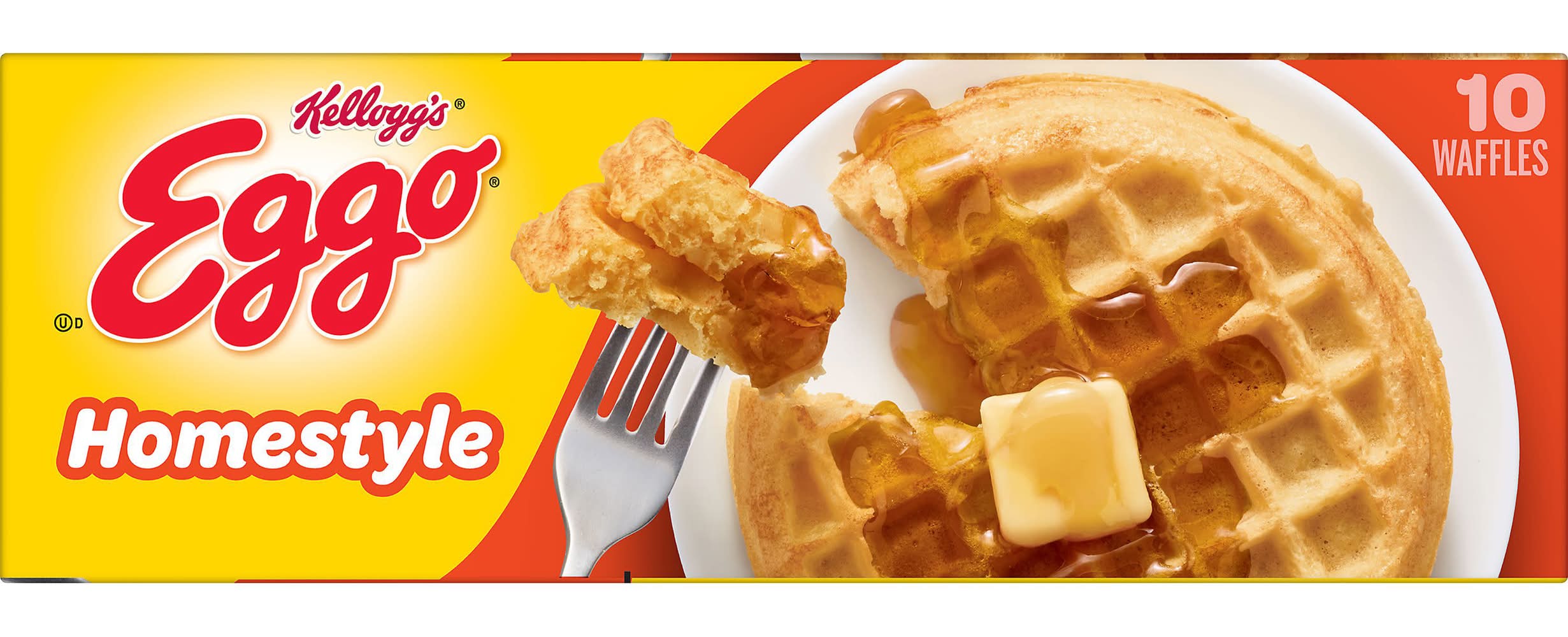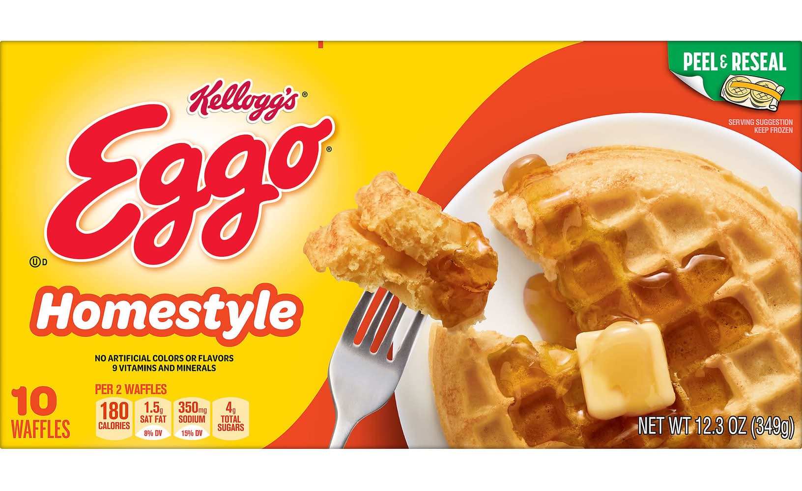 Wake up and greet the day with the feel-good taste of Kellogg's Eggo Homestyle Waffles. Includes one, 12.3-ounce box containing 10 waffles. Deliciously crispy and fluffy, our Eggo Homestyle Waffles are crafted with delicious ingredients. Pop these frozen waffles in the toaster or oven for a delightfully crisp texture and the familiar, inviting taste of homemade waffles. These tasty frozen waffles are made with pantry-perfect staples; and every serving provides a good source of 9 vitamins and minerals. Conveniently packaged and easy to prepare, Kellogg's Eggo Homestyle Waffles help bring warmth and smiles to fast-paced, busy mornings. Great for families and individuals alike, these delicious waffles are made to enjoy as part of a delicious breakfast. Try them with your favorite morning toppings such as butter and syrup, jellies and jam, peanut butter, hazelnut spread, fresh fruit, berries, whipped cream, and more. They're just so delicious, would you L'Eggo your Eggo? • Size: 12.3 OZ • Packaging: Reusable
