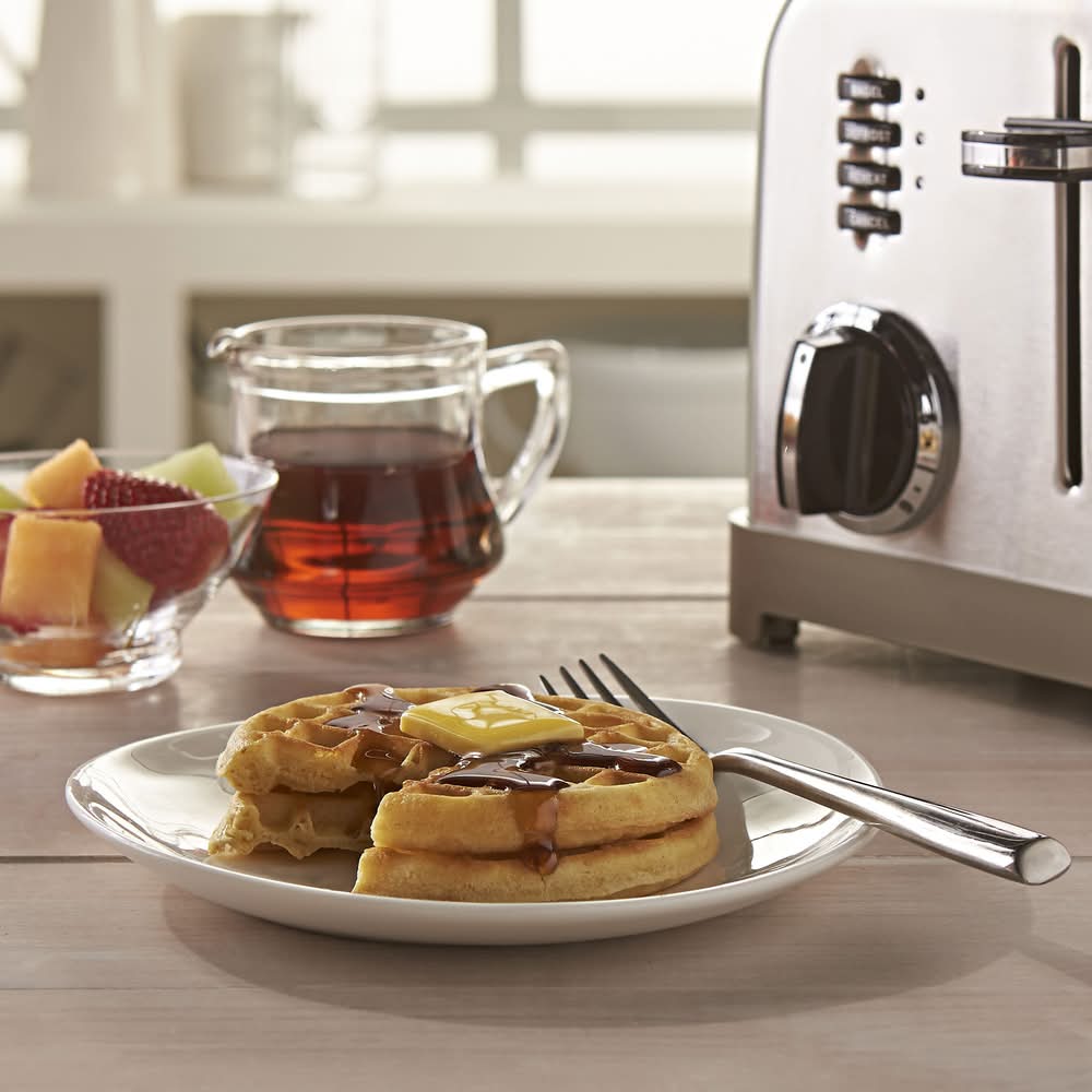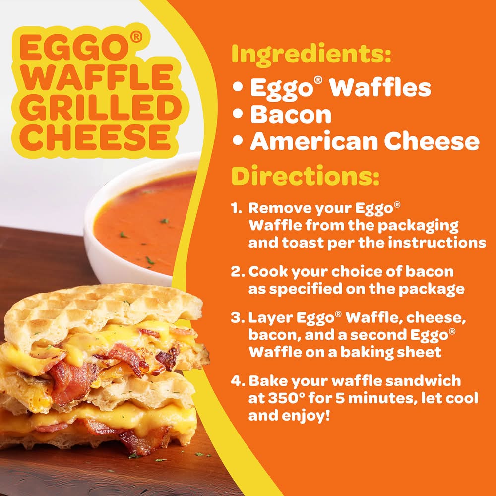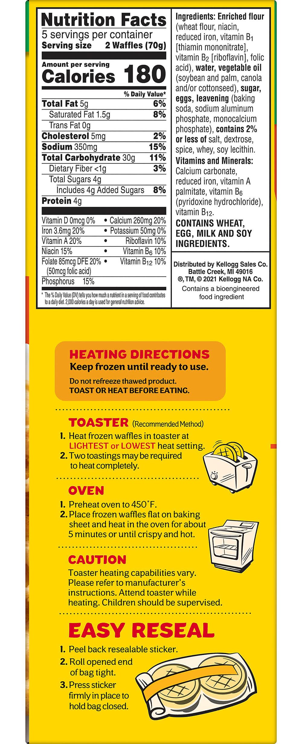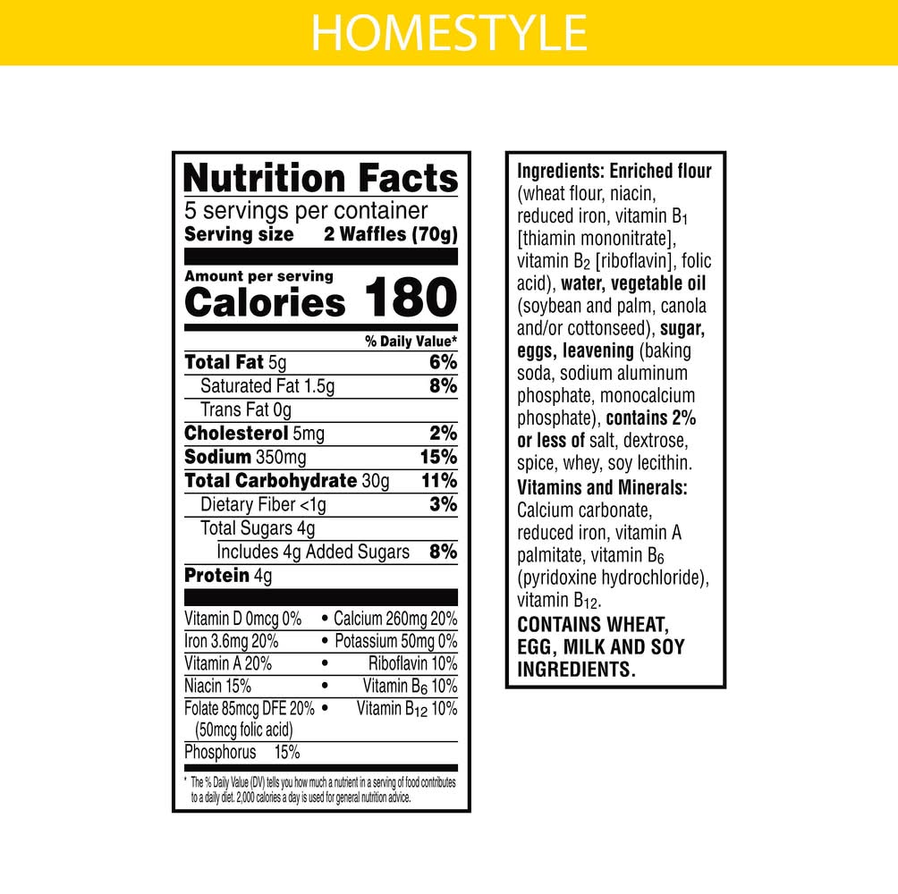Wake up and greet the day with the feel-good taste of Kellogg's Eggo Homestyle Waffles. Includes one, 12.3-ounce box containing 10 waffles. Deliciously crispy and fluffy, our Eggo Homestyle Waffles are crafted with delicious ingredients. Pop these frozen waffles in the toaster or oven for a delightfully crisp texture and the familiar, inviting taste of homemade waffles. These tasty frozen waffles are made with pantry-perfect staples; and every serving provides a good source of 9 vitamins and minerals. Conveniently packaged and easy to prepare, Kellogg's Eggo Homestyle Waffles help bring warmth and smiles to fast-paced, busy mornings. Great for families and individuals alike, these delicious waffles are made to enjoy as part of a delicious breakfast. Try them with your favorite morning toppings such as butter and syrup, jellies and jam, peanut butter, hazelnut spread, fresh fruit, berries, whipped cream, and more. They're just so delicious, would you L'Eggo your Eggo? • Size: 12.3 OZ • Packaging: Reusable
