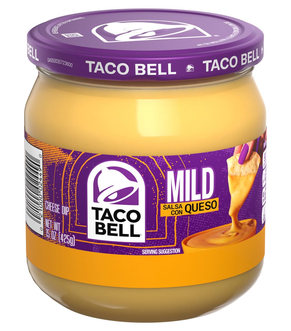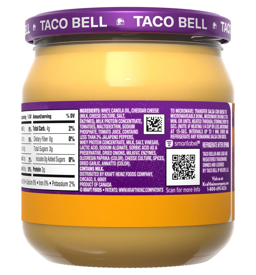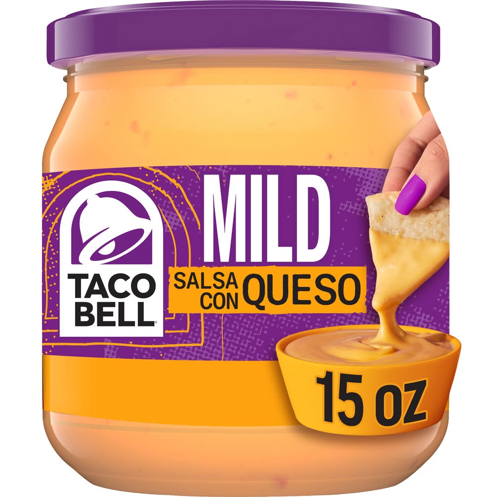 Live más at home with our Taco Bell Mild Salsa Con Queso Cheese Dip. Taco Bell makes mealtime more craveable with our cheesy dip made with zesty salsa, jalapeño peppers and cheddar cheese. Heat up our dip and serve with chips at mealtime, or enjoy our queso dip whenever you're craving a snack. Try our dip as a sauce to add some cheesy flavor to tacos, burritos, quesadillas and more. Each 15-ounce jar contains about 13 servings. Live more fervently, more authentically, more joyfully with Taco Bell. • Size: 15 OZ • Kraft Heinz Foods Company, Chicago, IL, 60601