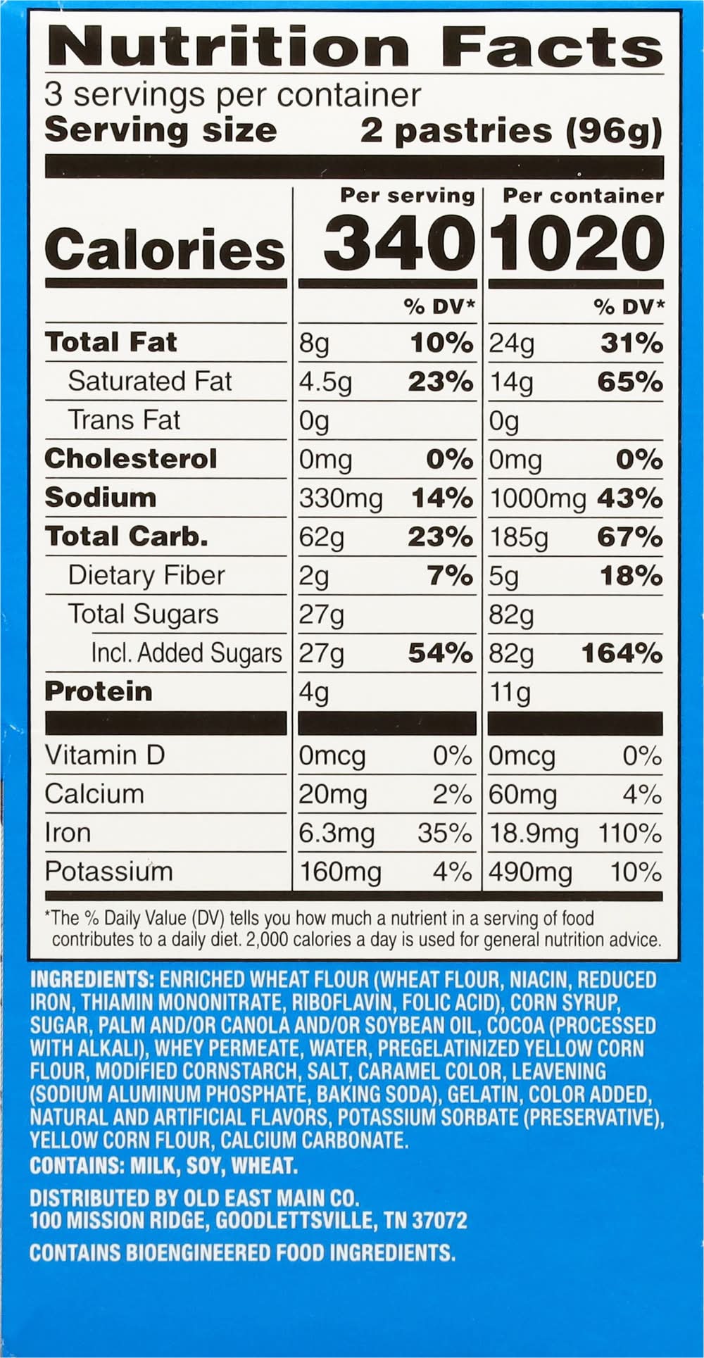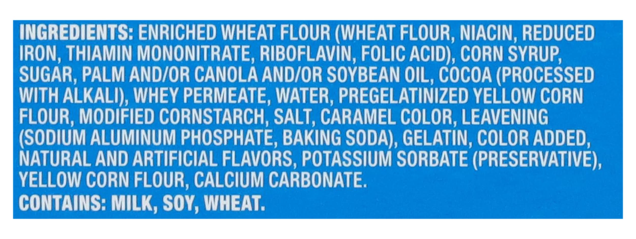 Ingredients: Enriched Wheat Flour (Wheat Flour, Niacin, Reduced Iron, Thiamin Mononitrate, Riboflavin, Folic Acid), Corn Syrup, Sugar, Palm and/or Canola and/or Soybean Oil, Cocoa (Processed with Alkali), Whey Permeate, Water, Pregelatinized Yellow Corn Flour, Modified Cornstarch, Salt, Caramel Color, Leavening (Sodium Aluminum Phosphate, Baking Soda), Gelatin, Color Added, Natural and Artificial Flavors, Potassium Sorbate (Preservative), Yellow Corn Flour, Calcium Carbonate Contains: Milk, Soybeans, Wheat, Corn