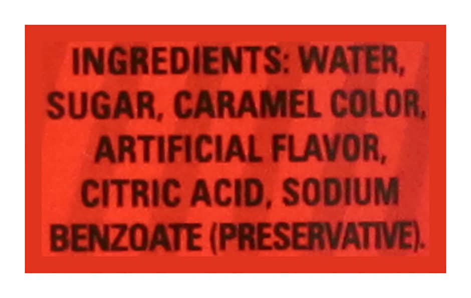Ingredients: Water, Sugar, Caramel Color, Artificial Flavor, Citric Acid, Sodium Benzoate (Preservative)