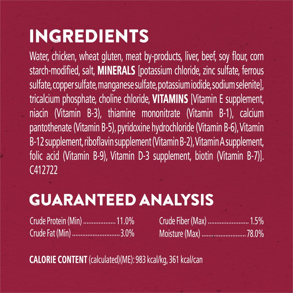 Ingredients: Water, Chicken, Wheat Gluten, Meat By-products, Liver, Beef, Soy Flour, Corn Starch-modified, Salt, Minerals [Potassium Chloride, Zinc Sulfate, Ferrous Sulfate, Copper Sulfate, Manganese Sulfate, Potassium Iodide, Sodium Selenite], Tricalcium Phosphate, Choline Chloride, Vitamins [Vitamin E Supplement, Niacin (Vitamin B-3), Thiamine Mononitrate (Vitamin B-1), Calcium Pantothenate (Vitamin B-5), Pyridoxine Hydrochloride (Vitamin B-6), Vitamin B-12 Supplement, Riboflavin Supplement (Vitamin B-2), Vitamin A Supplement, Folic Acid (Vitamin B-9), Vitamin D-3 Supplement, Biotin (Vitamin B-7)], . C412722