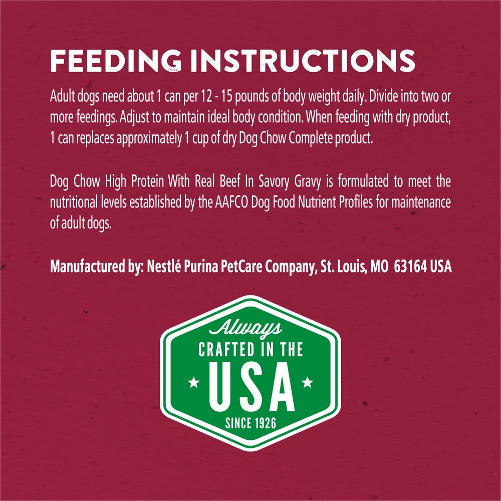 Show your dog just how much you care about him by putting Purina Dog Chow High Protein With Real Beef in Savory Gravy wet dog food on the menu. This delicious wet canned dog food recipe made with real beef comes packed with 40 grams of protein in each can to help your canine companion maintain his strong, lean muscles. Purina makes this Dog Chow dog food with high protein without artificial flavors or preservatives. This delicious gravy dog food provides 100 percent complete and balanced nutrition for adult dogs with no artificial colors, flavors or preservatives, so you can be sure you're making the right decisions for his health and well-being. Please your adult dog's palate with this tasty Dog Chow Dog Food recipe with tender chunks in gravy, ensuring he doesn't lose interest at mealtime. Watch as he savors every last bite when you fill his dinner bowl with this wholesome Purina Dog Chow High Protein Wet Dog Food With Real Beef in Savory Gravy. • Size: 13 OZ • Packaging: Reusable