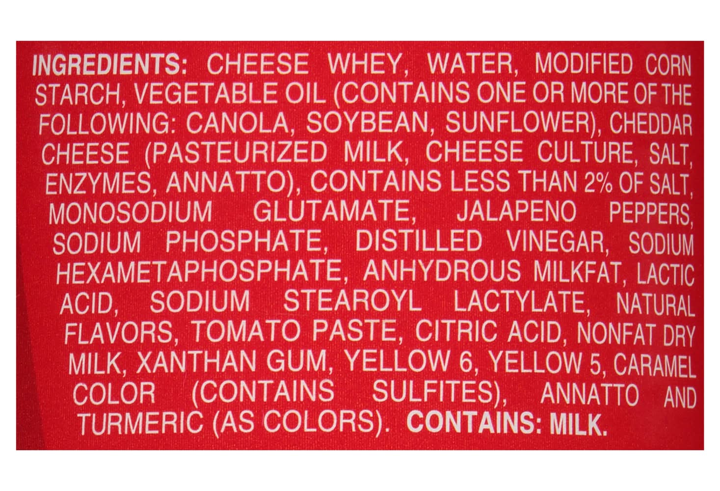 Ingredients: Cheese Whey, Water, Modified Corn Starch, Vegetable Oil (Contains One or More of the Following: Canola, Soybean, Sunflower), Cheddar Cheese (Pasteurized Milk, Cheese Culture, Salt, Enzymes, Annatto), Contains Less than 2% of Salt, Monosodium Glutamate, Jalapeno Peppers, Sodium Phosphate, Distilled Vinegar, Sodium Hexametaphosphate, Anhydrous Milkfat, Lactic Acid, Sodium Stearoyl Lactylate, Natural Flavors, Tomato Paste, Citric Acid, Nonfat Dry Milk, Xanthan Gum, Yellow 6, Yellow 5, Caramel Color (Contains Sulfites), Annatto and Turmeric (as Colors) Contains: Milk, Soybeans