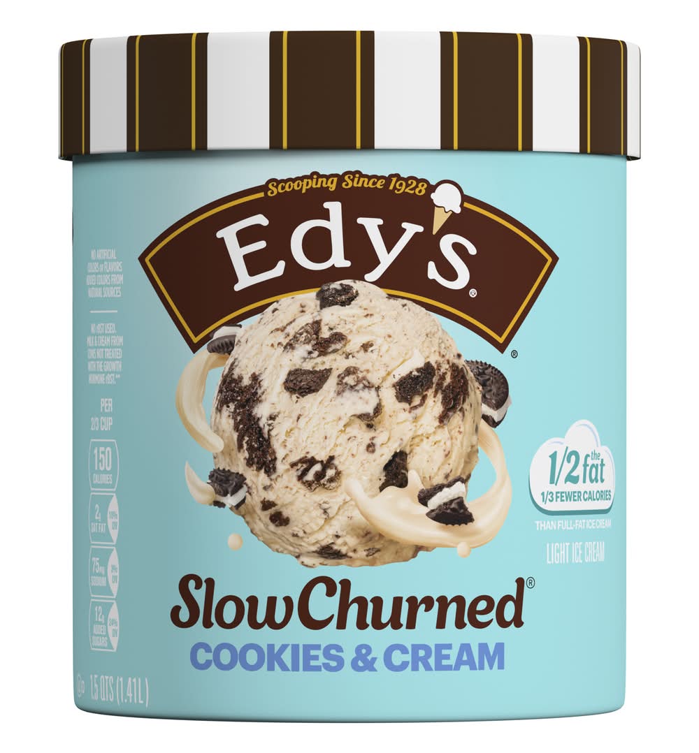 Discover a creamy, delicious treat with 1/2 the fat and 1/3 fewer calories than full-fat ice cream with Edy’s/Dreyer’s Slow Churned Cookies and Cream Light Ice Cream. Don’t be fooled by less fat and fewer calories, this light ice cream has all the creamy goodness of regular ice cream! Containing no artificial colors or flavors, this ice cream is also OU Kosher dairy certified and is made with milk and cream from cows not treated with the growth hormone rBST*. Long summer days are finally stretching into golden evenings. Celebrate by topping them off with this family favorite: fun and delicious cookies and cream light ice cream made with fresh milk and cream. How do we make Slow Churned light ice cream with 1/3 fewer calories and 1/2 the fat but with all the creaminess and goodness of regular ice cream? We start with milk and cream and mix our special recipe for scoops of perfection every time! For nearly a hundred years, Edy's/Dreyer's has been dedicated to serving you and your families the richest, creamiest ice cream with real, high-quality ingredients the whole family can enjoy together. Today, we honor our legacy of reinvention and optimism, by celebrating the ways people remix in their everyday lives. Whether your Saturday nights are a bit out of the ordinary, or you like adding a little something extra to your dessert. At Edy's/Dreyer's, we respect the remix, and we’re right there with you. Remixing Since Forever. • Flavor: Cookies & cream • Size: 48 OZ