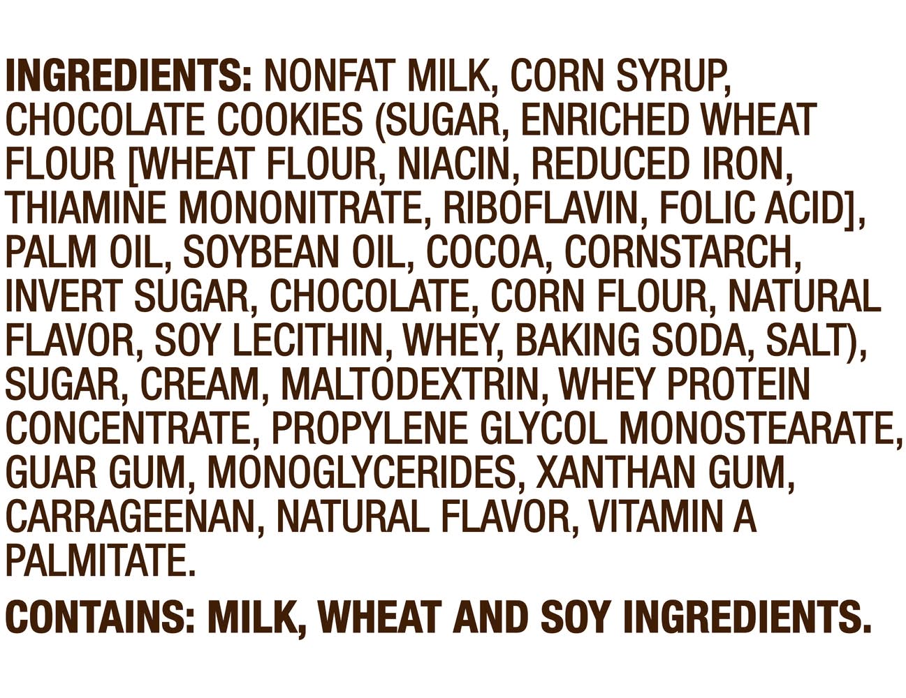 Ingredients: INGREDIENTSs: Non-fat milk, corn syrup, sugar, chocolate cookies (sugar; enriched wheat flour [wheat flour; niacin; reduced iron; thiamine mononitrate; riboflavin; folic acid]; palm oil; soybean oil; cocoa processed with alkali; invert sugar; yellow corn flour; chocolate; corn starch; salt; baking soda; whey; natural flavor; soy lecithin), cream, maltodextrin, whey protein concentrate, propylene glycol monostearate, guar gum, monoglycerides, xanthan gum, carrageenan, natural flavor, annatto color, vitamin A palmitate Contains: Milk, Wheat, Soybeans, Corn