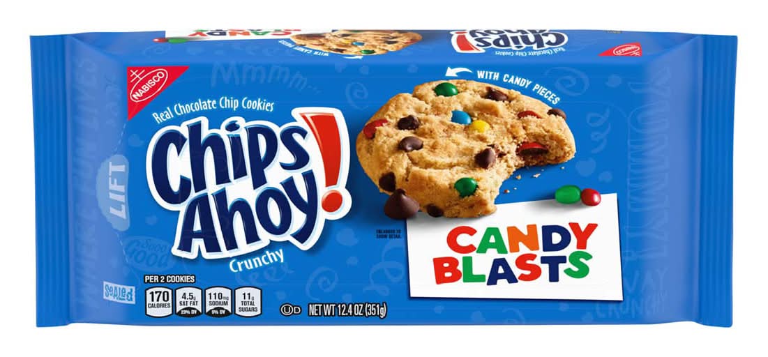 CHIPS AHOY! Crunchy Candy Blasts Chocolatey Chip Cookies are the CHIPS AHOY! cookies you love, baked to have just the right amount of crunch, but featuring colorful pieces of candy-coated fudge. Make lunches at school or work more exciting by including CHIPS AHOY! cookies for delightfully sweet snacks. Enjoy these sweet treats on their own or with your midday meal as lunch snacks. Pair them with ice cream or a glass of cold milk for after-work or after-school snacks. These crunchy CHIPS AHOY! snack cookies make wonderful birthday treats, sweet snacks, or movie snacks. Add the colorful cookies to goodie bags for party favors, gift baskets, care packages for college students, and more for a sweet, fun surprise. Regardless of the occasion, CHIPS AHOY! cookie snacks make a simple anytime dessert. The resealable package with its easy-pull tab helps to keep these certified kosher snack cookies fresh, making them wonderfully shareable office snacks and travel snacks. Size: 12.4 OZ