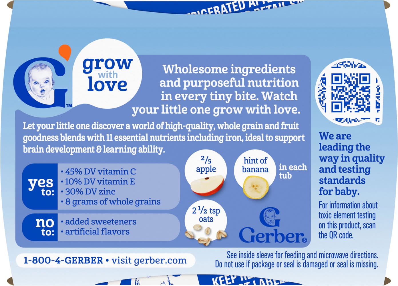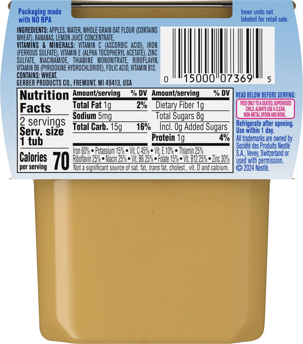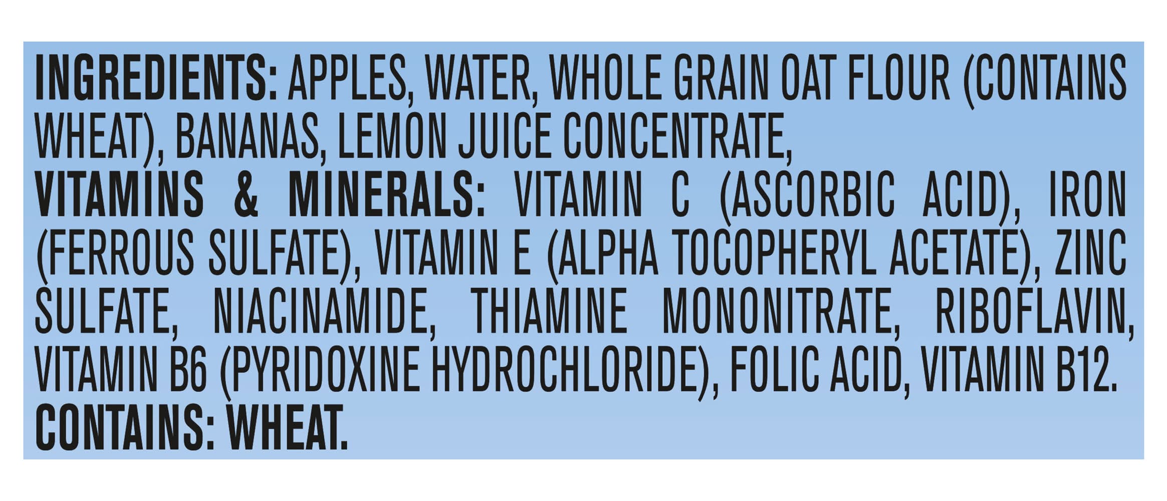 Ingredients: Apples, Water, Whole Grain Oat Flour (Contains Wheat), Bananas, Lemon Juice Concentrate, Vitamins & Minerals: Vitamin C (Ascorbic Acid), Iron (Ferrous Sulfate), Vitamin E (Alpha Tocopheryl Acetate), Zinc Sulfate, Niacinamide, Thiamine Mononitrate, Riboflavin, Vitamin B6 (Pyridoxine Hydrochloride), Folic Acid, Vitamin B12 Contains: Wheat, Oat