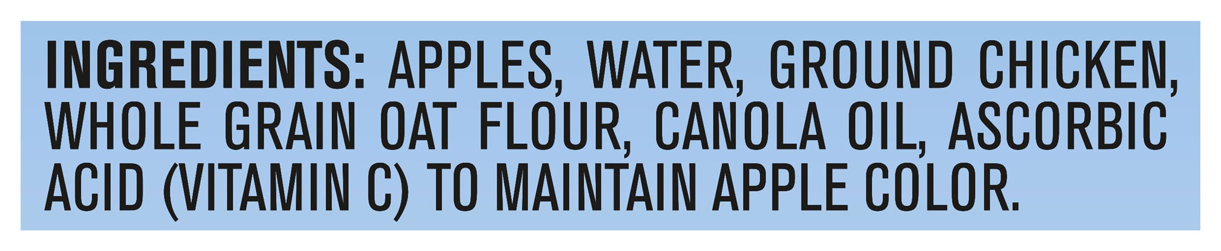 Ingredients: Apples, Water, Ground Chicken, Whole Grain Oat Flour, Canola Oil, Ascorbic Acid (Vitamin C) to Maintain Apple Color