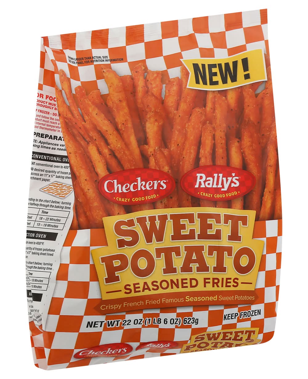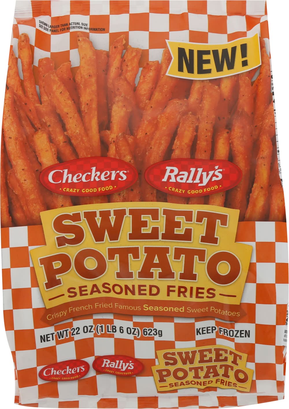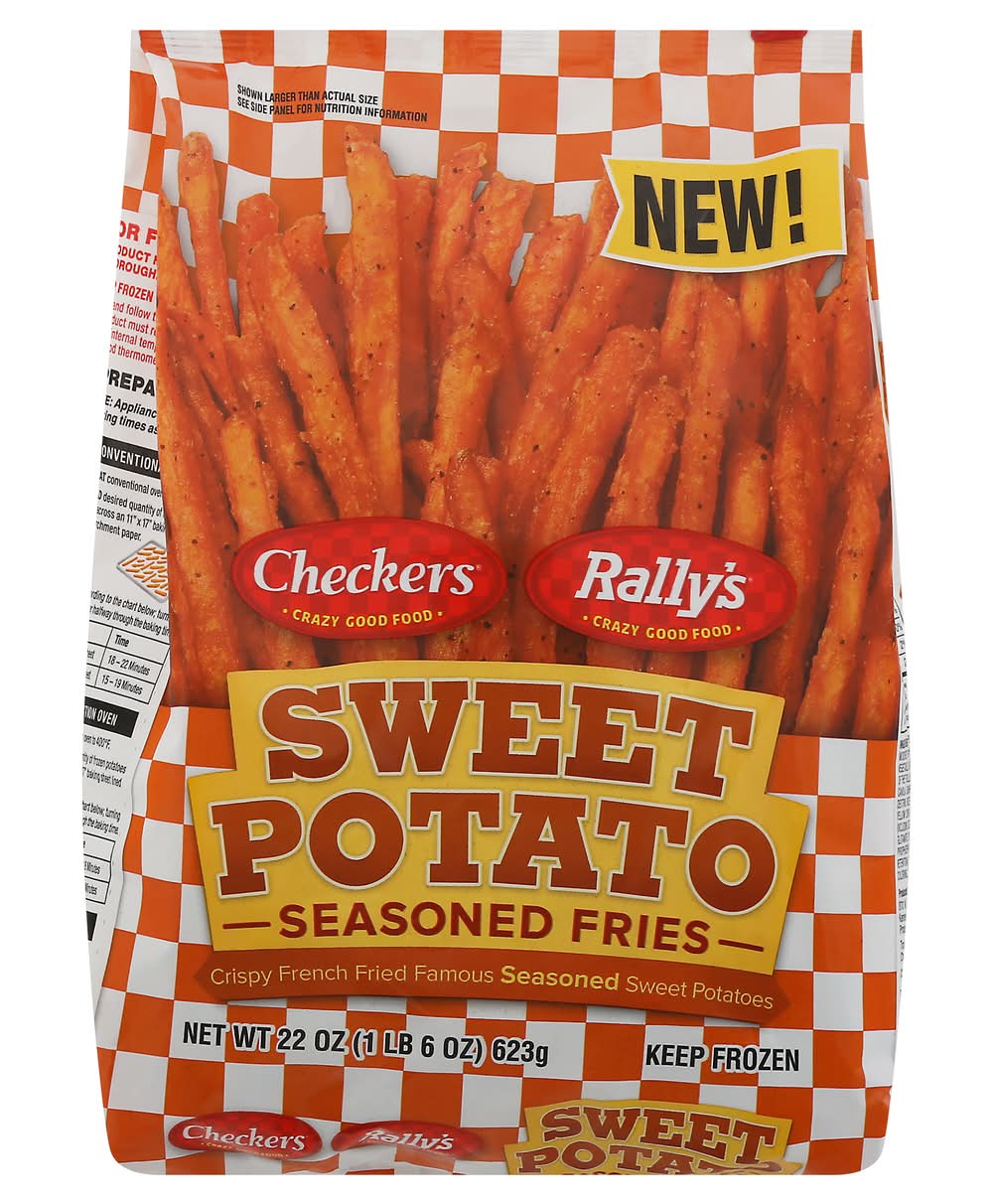 Crispy French fried famous seasoned sweet potatoes, See panel for nutrition information. Contains bioengineered food ingredients. New! Crazy good food! We've doubled down on our Famous Seasoned Fries Checkers and Rally's is famous for our Famous Seasoned Fries. People don't just love our battered seasoned fries, they're obsessed. The secret to their crave-ability is. oh come on, it's a secret. We're not going to give away the super special herb and spice blend that makes up our one-of-a-kind Famous Fry Seasoning! But we are going to give you another great way to enjoy it. Behold! Checkers and Rally's Famous Seasoned Sweet Potato Fries! All the greatness of the original, on a whole new tater! Bagged up and ready to hop in your oven and crush a craving any time it comes calling. • Flavor: Seasoned • Size: 22 OZ