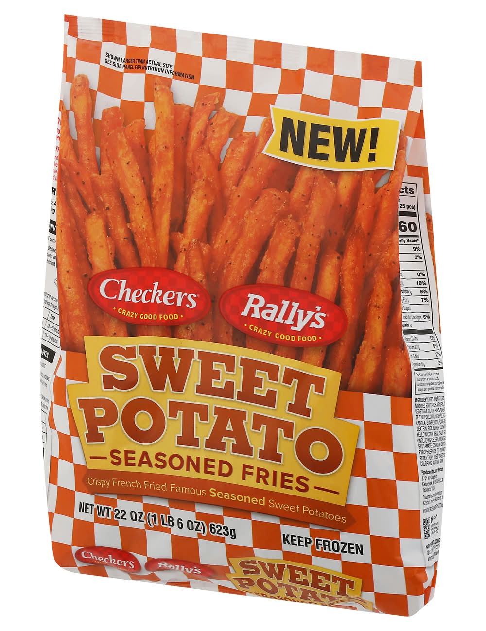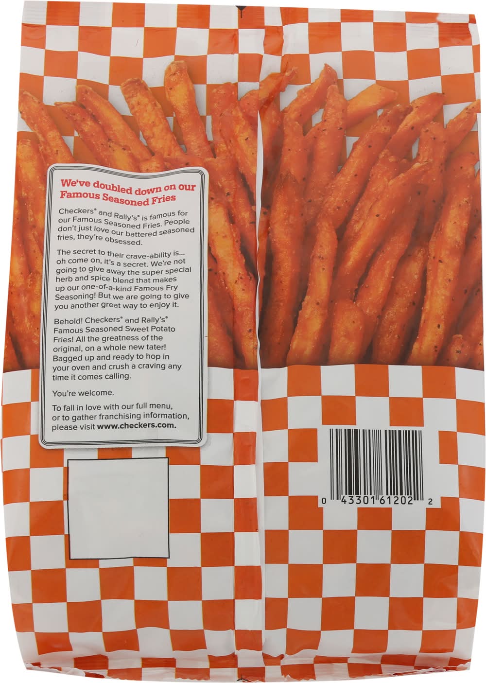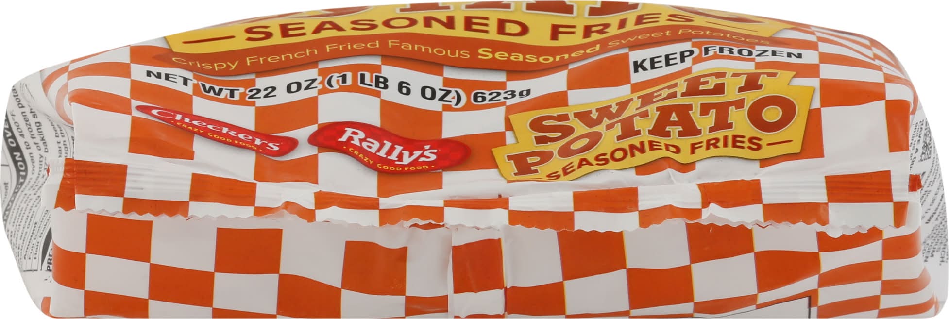 Crispy French fried famous seasoned sweet potatoes, See panel for nutrition information. Contains bioengineered food ingredients. New! Crazy good food! We've doubled down on our Famous Seasoned Fries Checkers and Rally's is famous for our Famous Seasoned Fries. People don't just love our battered seasoned fries, they're obsessed. The secret to their crave-ability is. oh come on, it's a secret. We're not going to give away the super special herb and spice blend that makes up our one-of-a-kind Famous Fry Seasoning! But we are going to give you another great way to enjoy it. Behold! Checkers and Rally's Famous Seasoned Sweet Potato Fries! All the greatness of the original, on a whole new tater! Bagged up and ready to hop in your oven and crush a craving any time it comes calling. • Flavor: Seasoned • Size: 22 OZ