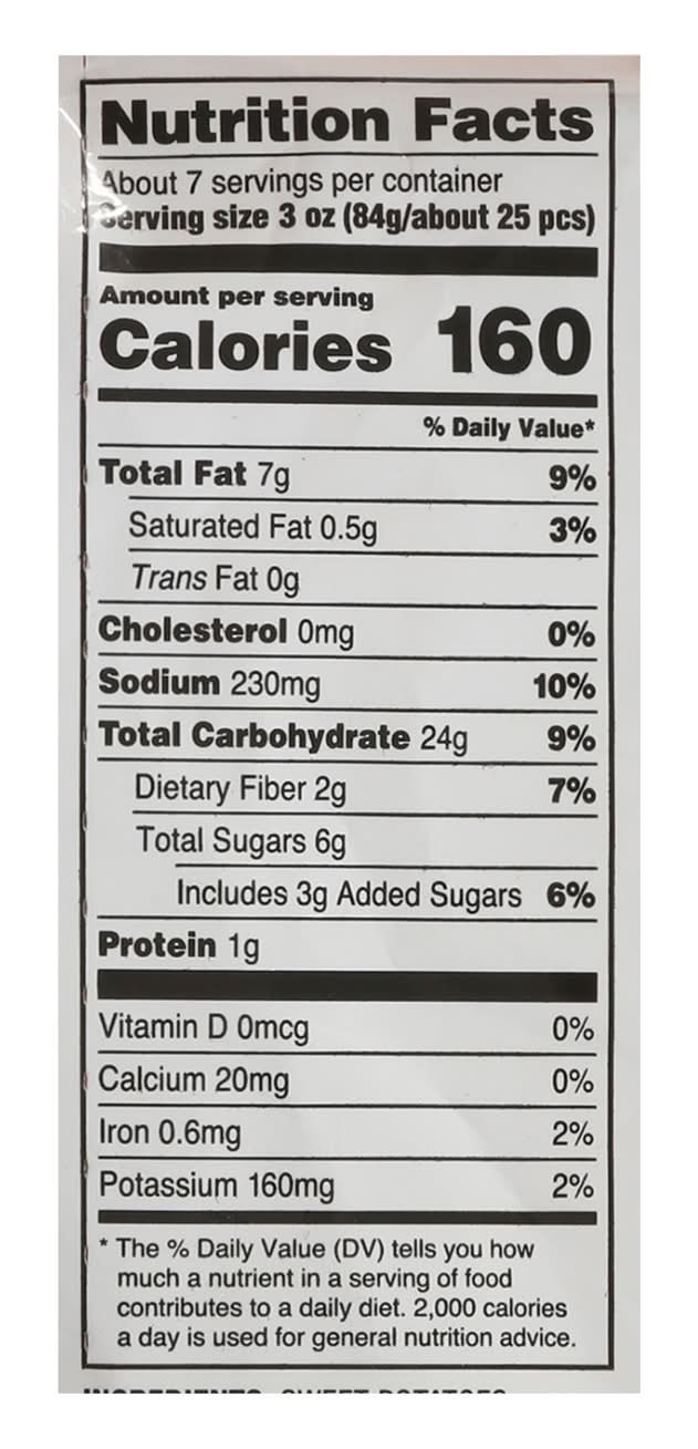 Ingredients: Sweet Potatoes, Modified Food Starch (Corn, Tapioca), Vegetable Oil (Contains One or More of the Following: High Oleic Canola, Canola, Sunflower), Cane Sugar, Dextrin, Rice Flour, Corn Starch, Yellow Corn Meal, Salt, Spices (Including Celery), Monosodium Glutamate, Disodium Dihydrogen Pyrophosphate (to Promote Color Retention), Dried Yeast, Spice and Coloring, Xanthan Gum Contains: Corn, Celery