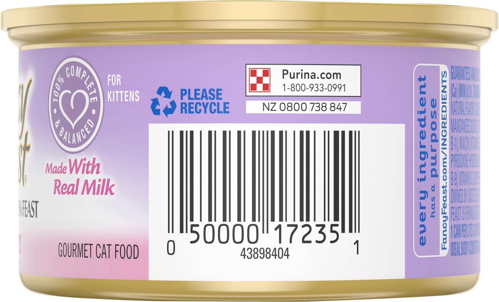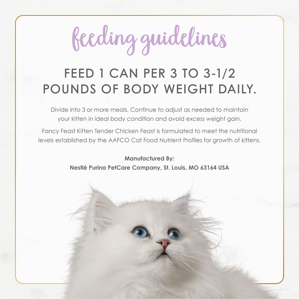 Delight your growing kitten with an exceptional mealtime experience specially made for kittens when you serve them Purina Fancy Feast Tender Chicken Feast canned kitten food pate. Featuring the mouthwatering taste of real chicken, this gourmet cat wet food is developed in partnership with Purina’s expert nutritionists to deliver 100 percent complete and balanced wet food for kittens with no artificial colors or preservatives. Each serving of this protein-rich, gourmet Fancy Feast cat food for kittens scintillates your lovable feline companion’s senses with an alluring aroma, irresistible taste, and enticing texture for an unforgettable mealtime experience. Plus, you can rest assured that this kitten food wet recipe is thoughtfully crafted for quality and safety in Purina-owned U.S. facilities, so you know your kitten is getting high-quality food that’s made with care. Help your kitten thrive with Purina Fancy Feast Tender Chicken Feast canned kitten food pate. • Size: 3 OZ • Packaging: Reusable