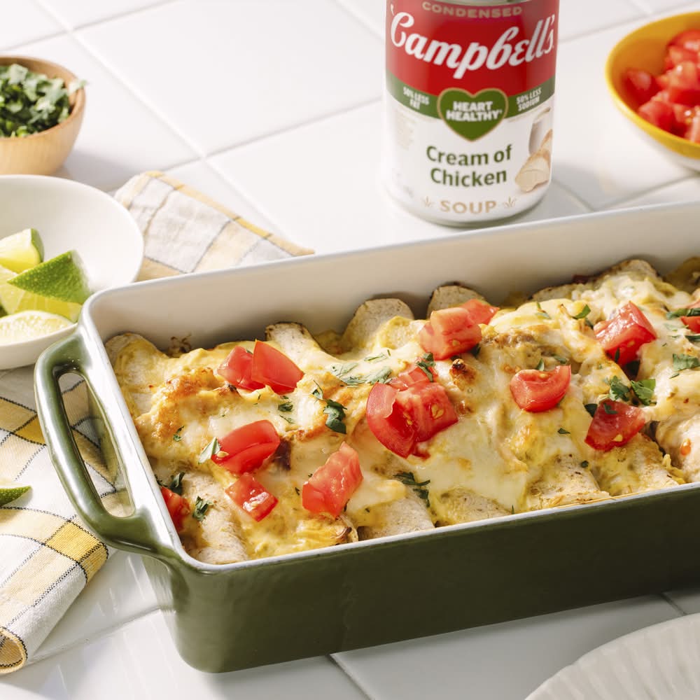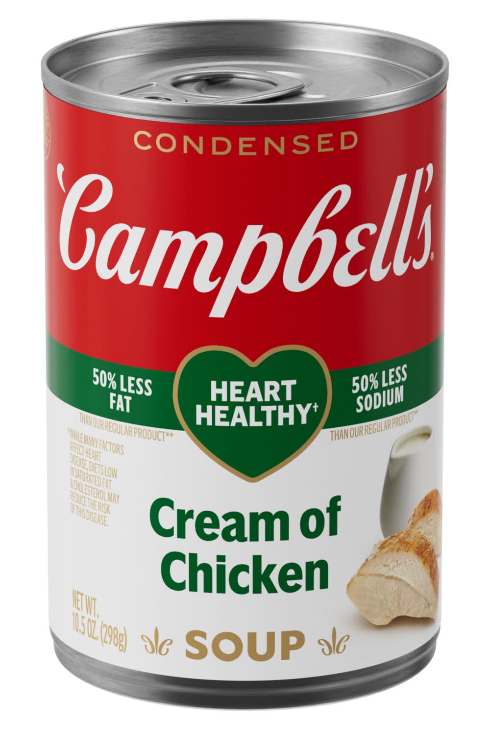 Add rich, creamy flavor to your favorite dishes with Campbell's Condensed Heart Healthy Cream of Chicken Soup. This creamy chicken soup is crafted with farm-fresh cream, chicken stock, and tender chicken meat with no antibiotics to provide a deliciously smooth foundation to any recipe. The result is a heart healthy soup with 50% less fat and 50% less sodium than our regular product. Use it as an ingredient in recipes like Healthy Chicken Enchiladas, or substitute it for roux or bechamel as a sauce starter. Campbell’s convenient canned soup is a year-round pantry staple and a must-have for creating something quick and easy. It's also delicious on its own or with a sandwich or salad. Simply mix the condensed soup with 1 can of water or nonfat milk and microwave on high for 3 to 3.5 minutes, or heat in a pot on the stove, stirring occasionally. Each 10.5 oz recyclable can contains about 2.5 servings of microwave soup. (While many factors affect heart disease, diets low in saturated fat and cholesterol may reduce the risk of this disease. Contains 410mg sodium and 2.5g of fat per serving vs. 870mg sodium and 8g fat in our regular Cream of Chicken) • Size: 10.5 OZ • Campbell Soup Company, Camden, NJ, • Packaging: Reusable