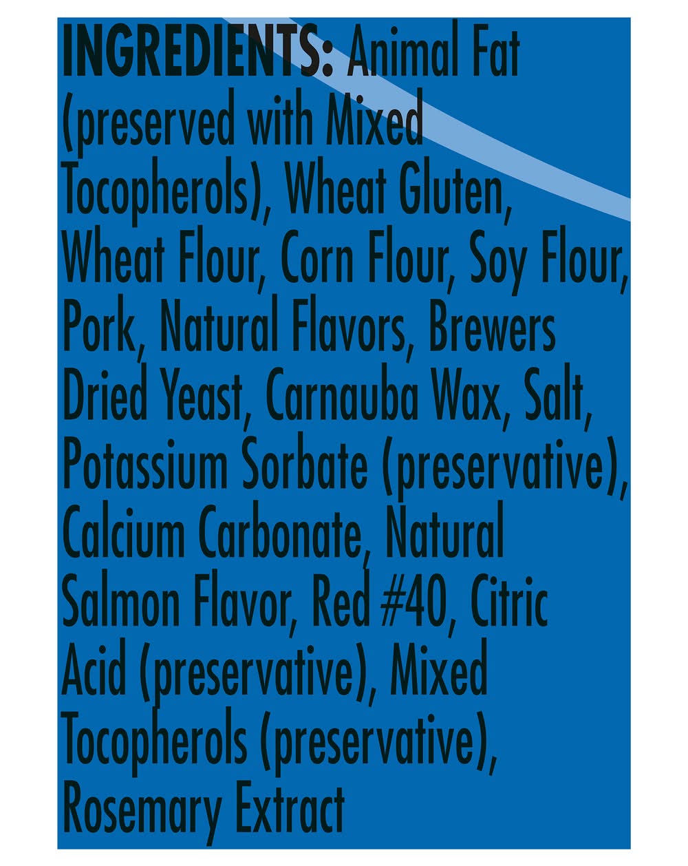 Ingredients: Animal Fat (Preserved with Mixed Tocopherols), Wheat Gluten, Wheat Flour, Corn Flour, Soy Flour, Pork, Natural Flavors, Brewers Dried Yeast, Carnauba Wax, Salt, Potassium Sorbate (Preservative), Calcium Carbonate, Natural Salmon Flavor, Red 40, Citric Acid (Preservative), Mixed Tocopherols (Preservative), Rosemary Extract Contains: Wheat, Gluten, Corn, Soybeans, Fish, Salmon