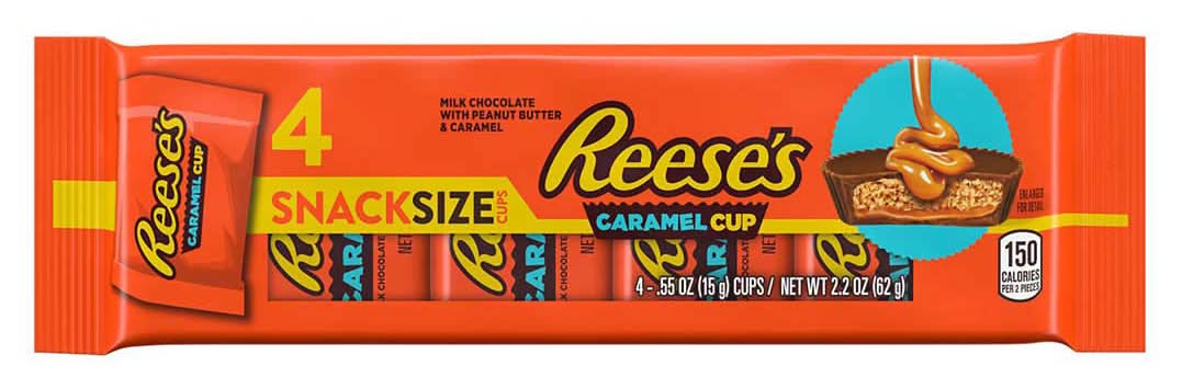 Get ready to taste perfection! You can't beat the old-fashioned, match-made-in-heaven when it comes to creamy milk chocolate combined with delicious peanut butter, now with a decadent caramel layer. Milk Chocolate Snack Size Peanut Butter Cups are ready to be your go-to treat all year long. Bring a few packs along to the next sporting event, birthday party and movie marathon for an extra bite of peanut butter and caramel goodness. Store this snack size bag in your pantry to easily slip into lunch boxes, gift bags and purses for a midday surprise. • Pack size: 4 • Size: 2.2 OZ