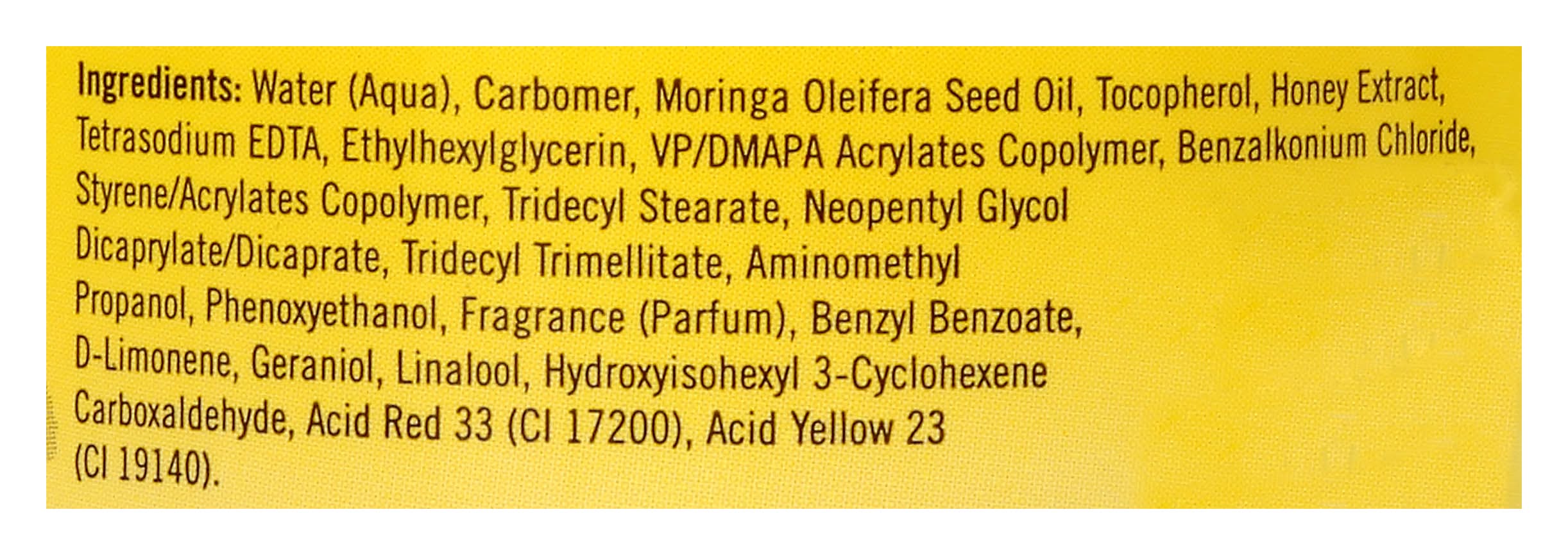 Ingredients: Water (Aqua), Carbomer, Moringa Oleifera Seed Oil, Tocopherol, Honey Extract, Tetrasodium EDTA, Ethylhexylglycerin, VP/DMAPA Acrylates Copolymer, Benzalkonium Chloride, Styrene/Acrylates Copolymer, Tridecyl Stearate, Neopentyl Glycol, Dicaprylate/Dicaprate, Tridecyl Trimellitate, Aminomethyl Propanol, Phenoxyethanol, Fragrance (Parfum), Benzyl Benzoate, D-Limonene, Geraniol, Linalool, Hydroxyisohexyl 3-Cyclohexene Carboxaldehyde, Acid Red 33 (CI 17200), Acid Yellow 23 (CI 19140)