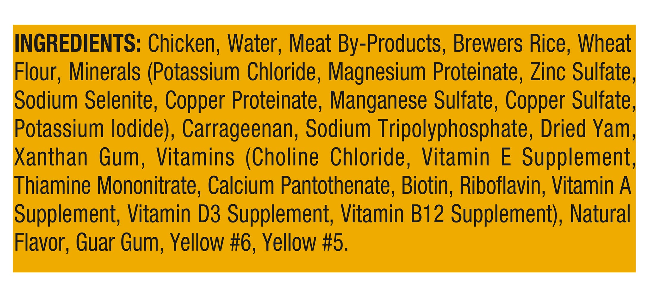 Ingredients: Chicken, Water, Meat By-Products, Brewers Rice, Wheat Flour, Minerals (Potassium Chloride, Magnesium Proteinate, Zinc Sulfate, Sodium Selenite, Copper Proteinate, Manganese Sulfate, Copper Sulfate, Potassium Iodide), Carrageenan, Sodium Tripolyphosphate, Dried Yam, Xanthan Gum, Vitamins (Choline Chloride, Vitamin E Supplement, Thiamine Mononitrate, Calcium Pantothenate, Biotin, Riboflavin, Vitamin a Supplement, Vitamin D3 Supplement, Vitamin B12 Supplement), Natural Flavor, Guar Gum, Yellow #6, Yellow #5 Contains: Wheat