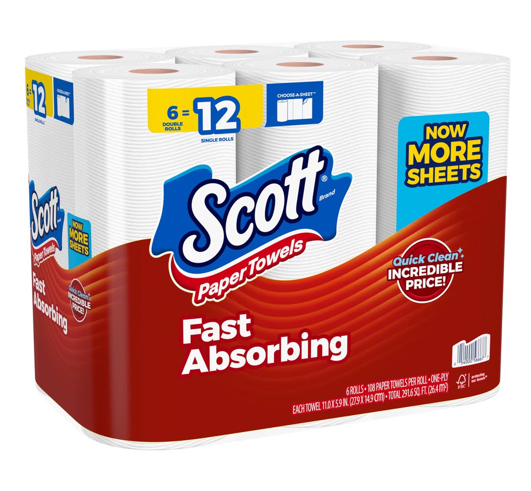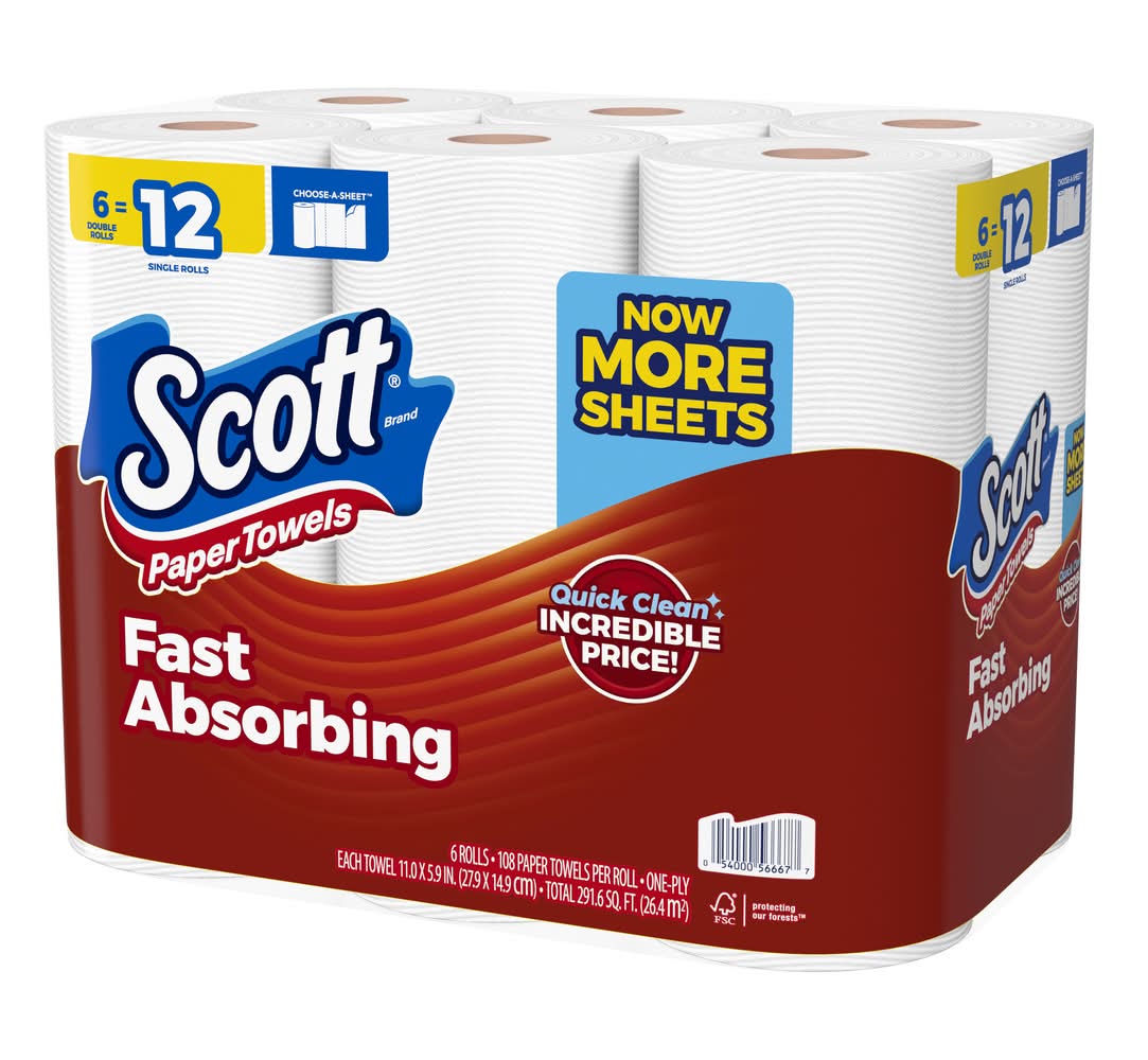 Scott Paper Towels, Choose-A-Sheet, 6 Double Rolls = 12 Regular Rolls (108 Sheets Per Roll) • Size: 11 X 5.9 in • Packaging: Reusable