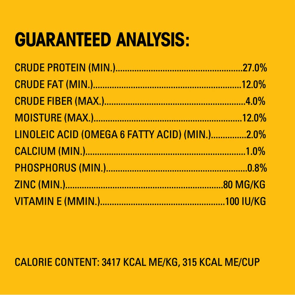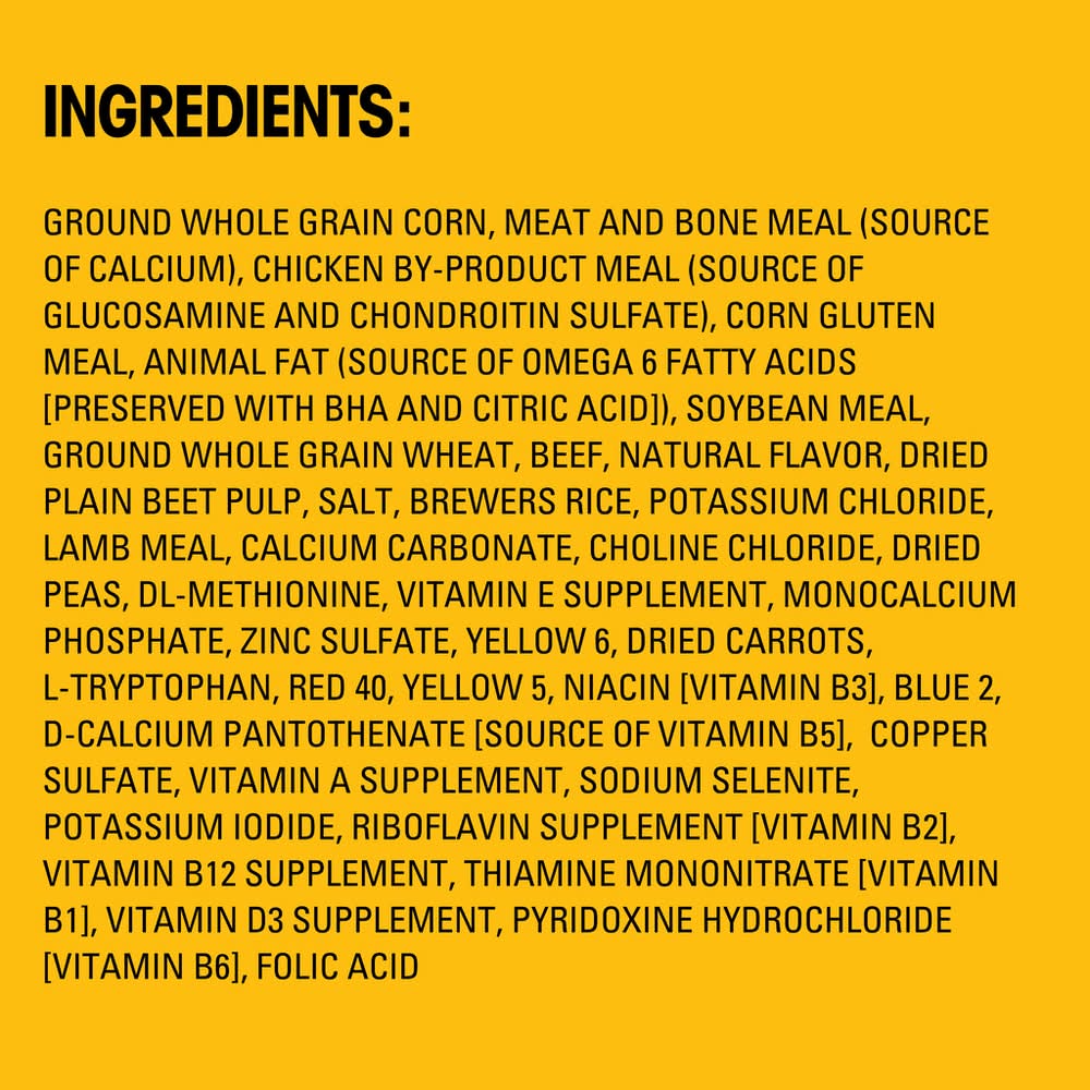 Ingredients: INGREDIENTS: Ground Whole Grain Corn, Meat and Bone Meal (source of Calcium), Chicken by-Product Meal (source of Glucosamine and Chondroitin Sulfate), Corn Gluten Meal, Animal Fat (source of Omega 6 Fatty Acids [preserved with BHA and Citric Acid]), Soybean Meal, Ground Whole Grain Wheat, Beef, Natural Flavor, Dried Plain Beet Pulp, Salt, Brewers Rice, Potassium Chloride, Lamb Meal, Calcium Carbonate, Choline Chloride, Dried Peas, DL-Methionine, Vitamin E Supplement, Monocalcium Phosphate, Zinc Sulfate, Yellow 6, Dried Carrots, L-Tryptophan, Red 40, Yellow 5, Niacin [Vitamin B3], Blue 2, D-Calcium Pantothenate [source of Vitamin B5], Copper Sulfate, Vitamin A Supplement, Sodium Selenite, Potassium Iodide, Riboflavin Supplement [Vitamin B2], Vitamin B12 Supplement, Thiamine Mononitrate [Vitamin B1], Vitamin D3 Supplement, Pyridoxine Hydrochloride [Vitamin B6], Folic Acid