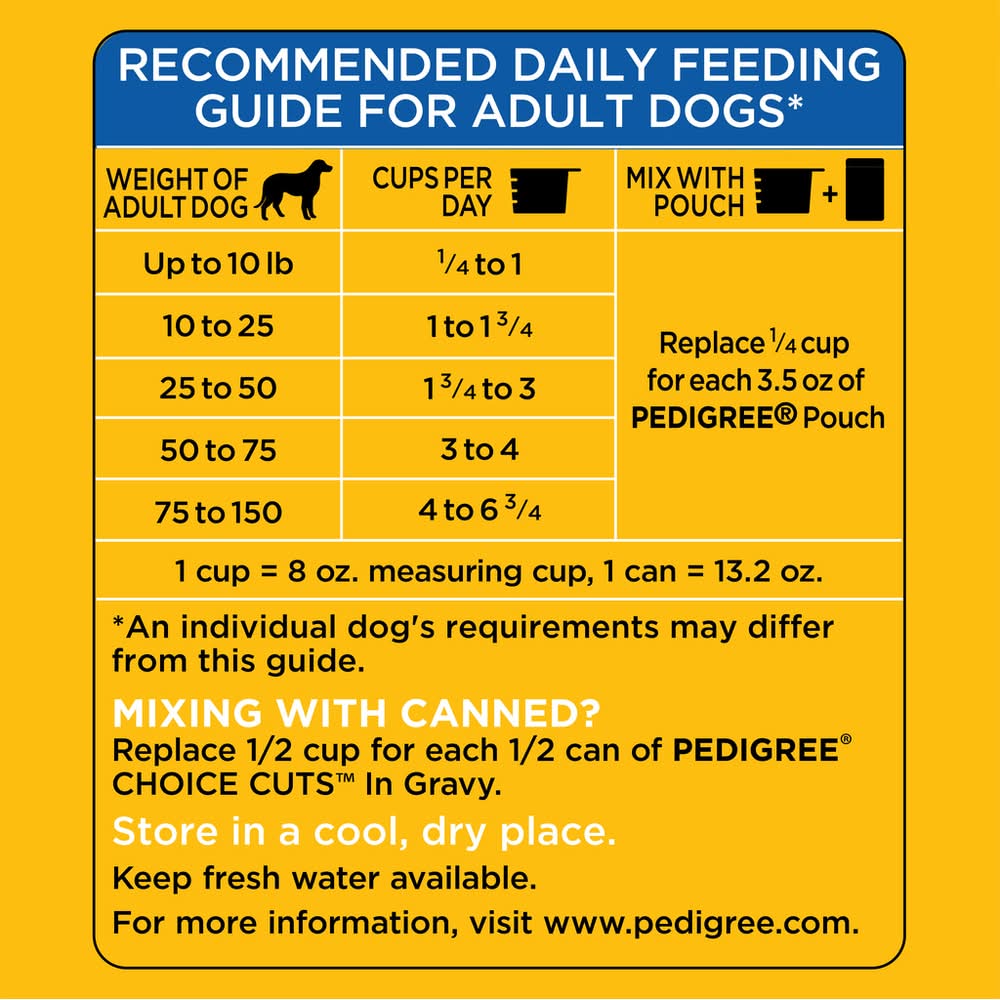 Directions: recommended daily feeding guide for adult dogs (an individual dog's requirements may differ from this guide): weight of adult dog: up to 10 lb; 1/4 to 1 cups per day. weight of adult dog: 10 to 25; 1 to 1 3/4 cups per day. weight of adult dog: 25 to 50; 1 3/4 to 3 cups per day. weight of adult dog: 50 to 75; 3 to 4 cups per day. weight of adult dog: 75 to 150; 4 to 6 3/4 cups per day. mix with pouch: replace 1/4 cup for each 3.5 oz of pedigree pouch. 1 cup = 8 oz. measuring cup, 1 can = 13.2 oz. mixing with canned? replace 1/2 cup for each 1/2 can of pedigree choice cuts in gravy. store in a cool, dry place. keep fresh water available. for more information, visit www.pedigree.com.