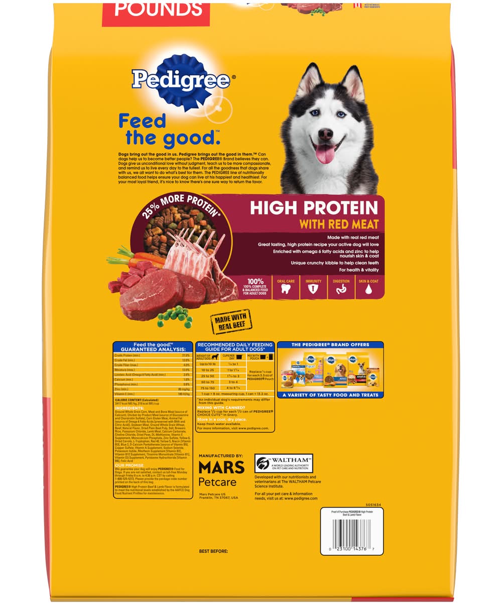 The PEDIGREE line of nutritionally balanced food helps ensure your dog can live their happiest and healthiest life. Our protein rich recipe is made with real red meat, and 25% more protein than Adult Complete Nutrition. It’s always 100% complete and balanced for canines with no added sugar, no artificial flavors, and no high fructose corn syrup. Let PEDIGREE nourish your dog’s skin and coat with essential fatty acids and minerals, and help clean your dog’s teeth with unique crunchy kibble. Because with all the goodness that dogs share with us, we all want to do what's best for them. Size: 14 LB