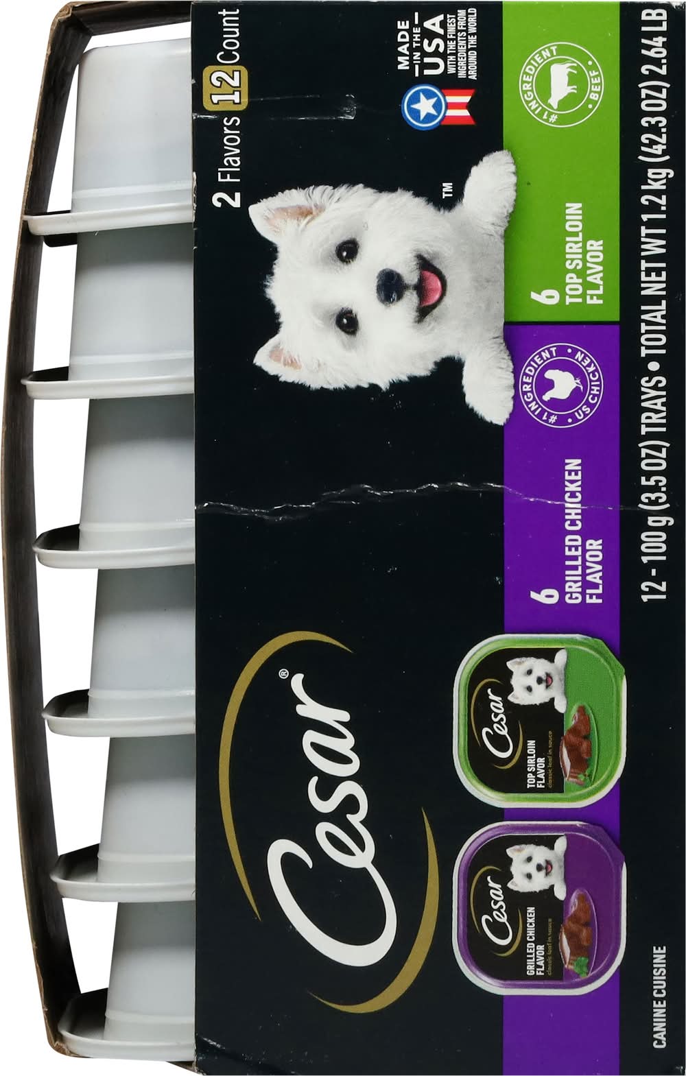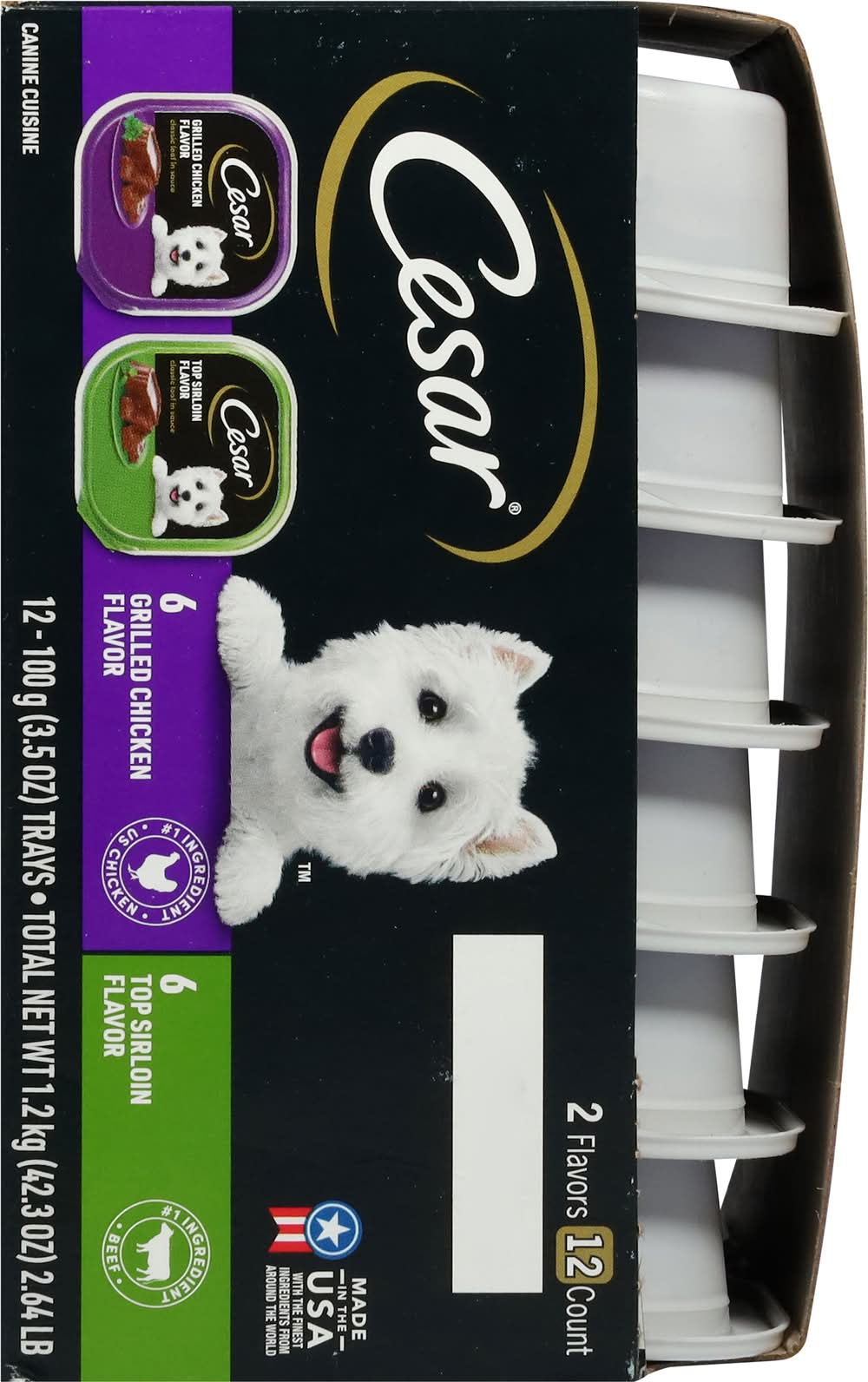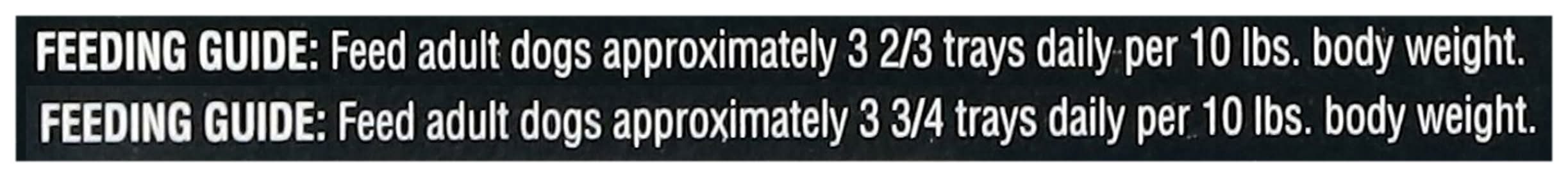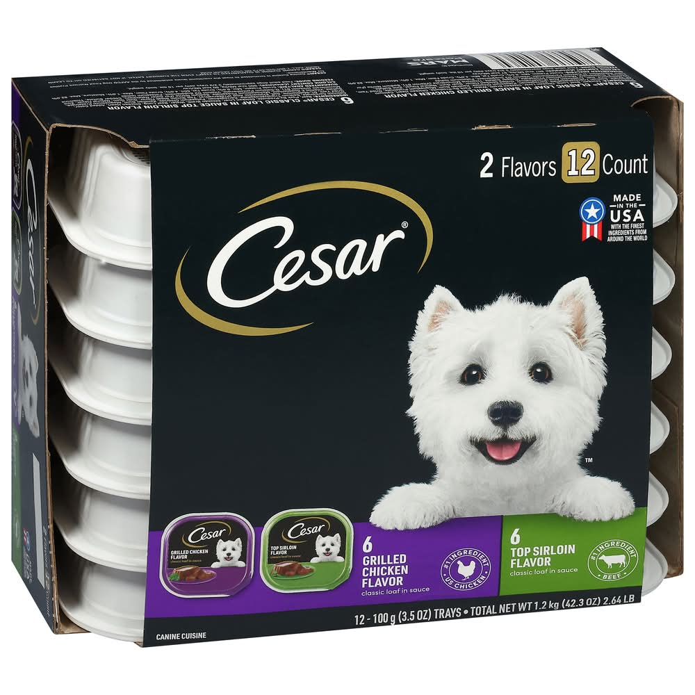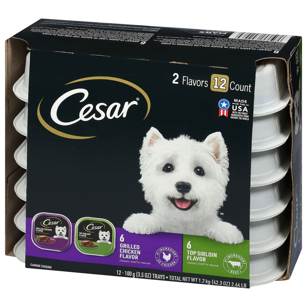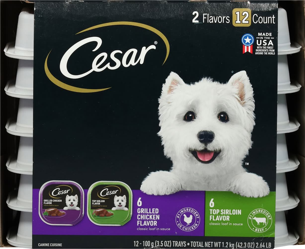 Cesar classic loaf in sauce grilled chicken flavor: feeding guide: feed adult dogs approximately 3-3/4 trays daily per 10 lbs. body weight. cesar classic loaf in sauce top sirloin flavor : feeding guide: feed adult dogs approximately 3-2/3 trays daily per 10 lbs. body weight.
