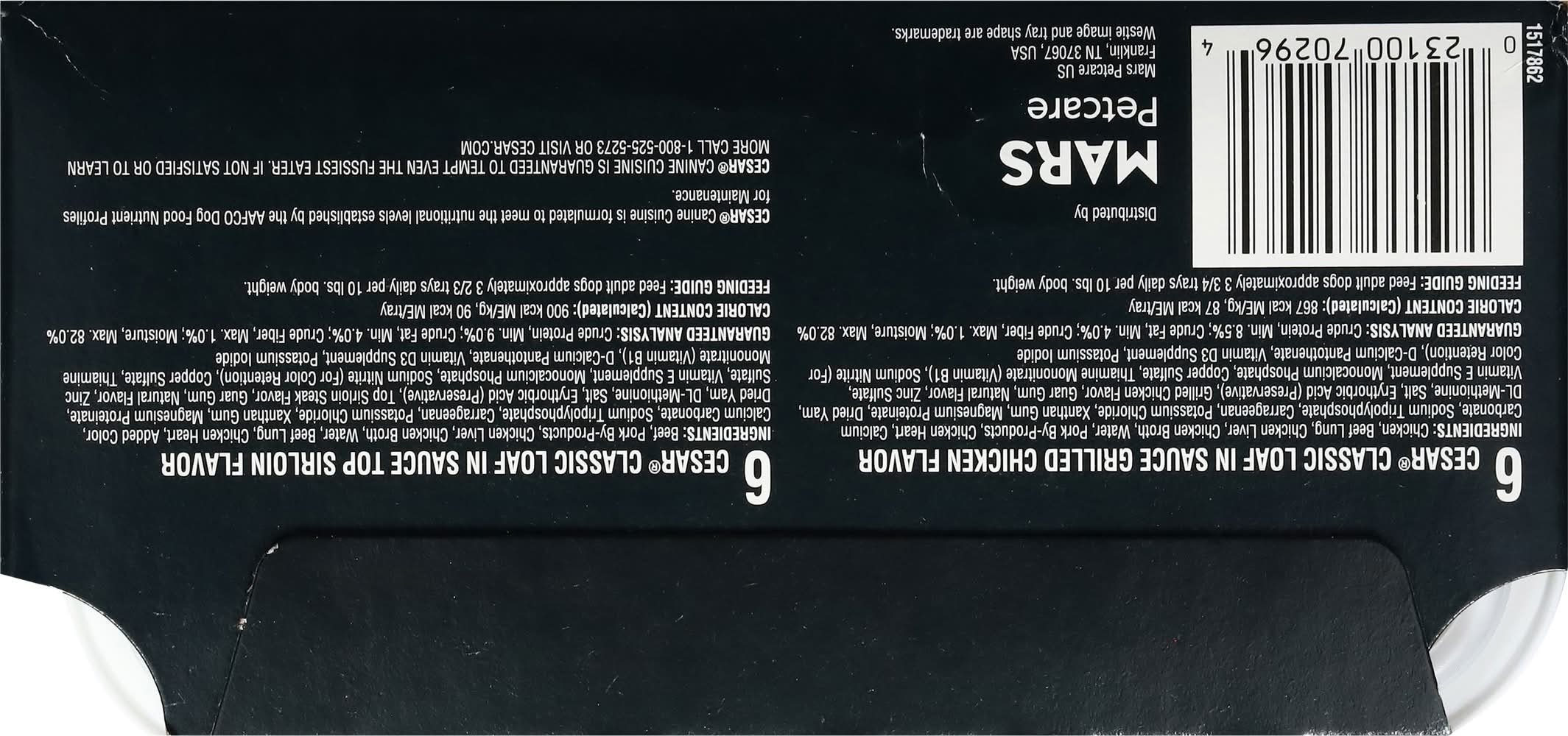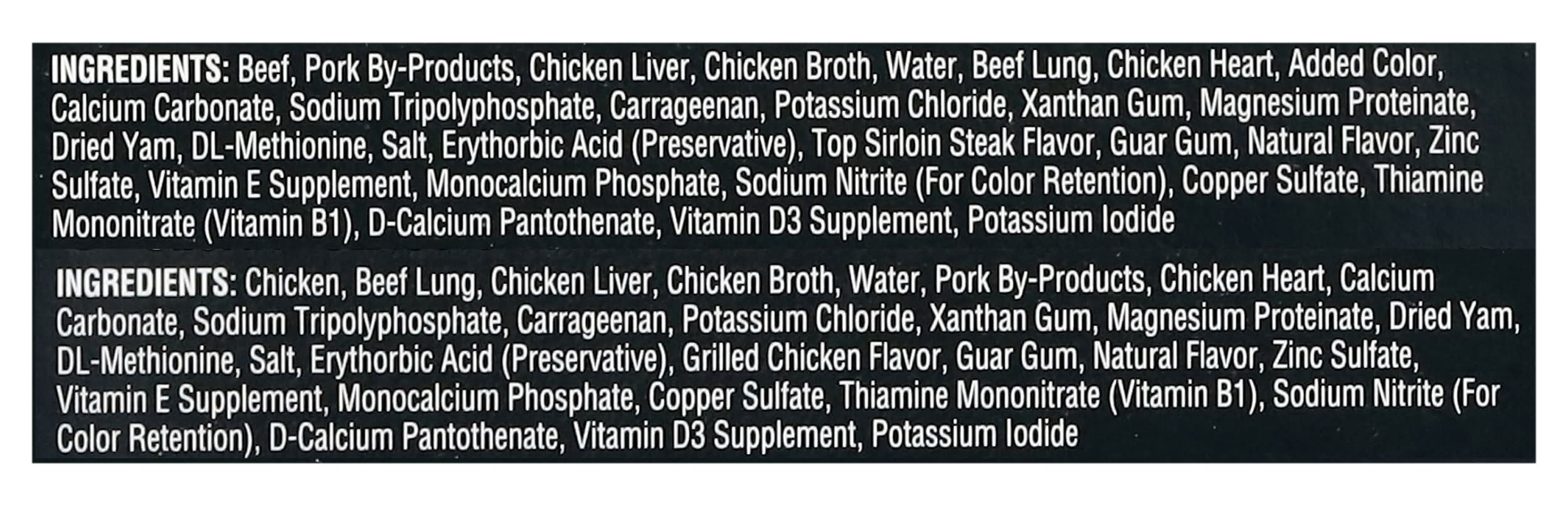 Ingredients: Cesar Classic Loaf in Sauce Grilled Chicken Flavor: Chicken, Beef Lung, Chicken Liver, Chicken Broth, Water, Pork By-Products, Chicken Heart, Calcium Carbonate, Sodium Tripolyphosphate, Carrageenan, Potassium Chloride, Xanthan Gum, Magnesium Proteinate, Dried Yam, DL-Methionine, Salt, Erythorbic Acid (Preservative), Grilled Chicken Flavor, Guar Gum, Natural Flavor, Zinc Sulfate, Vitamin E Supplement, Monocalcium Phosphate, Copper Sulfate, Thiamine Mononitrate (Vitamin B1), Sodium Nitrite (for Color Retention), D-Calcium Pantothenate, Vitamin D3 Supplement, Potassium Iodide. Cesar Classic Loaf in Sauce Top Sirloin Flavor: Beef, Pork By-Products, Chicken Liver, Chicken Broth, Water, Beef Lung, Chicken Heart, Added Color, Calcium Carbonate, Sodium Tripolyphosphate, Carrageenan, Potassium Chloride, Xanthan Gum, Magnesium Proteinate, Dried Yam, DL-Methionine, Salt, Erythorbic Acid (Preservative), Top Sirloin Steak Flavor, Guar Gum, Natural Flavor, Zinc Sulfate, Vitamin E Supplement, Monocalcium Phosphate, Sodium Nitrite (for Color Retention), Copper Sulfate, Thiamine Mononitrate (Vitamin B1), D-Calcium Pantothenate, Vitamin D3 Supplement, Potassium Iodide