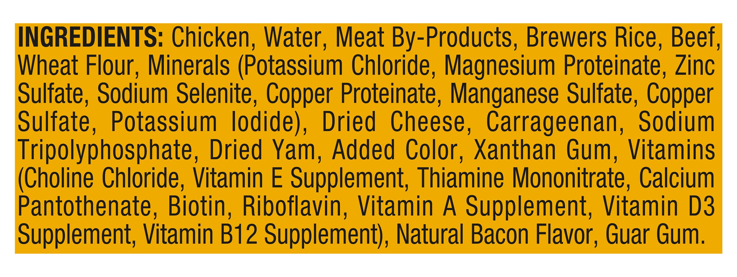 Ingredients: Chicken, Water, Meat By-Products, Brewers Rice, Beef, Wheat Flour, Minerals (Potassium Chloride, Magnesium Proteinate, Zinc Sulfate, Sodium Selenite, Copper Proteinate, Manganese Sulfate, Copper Sulfate, Potassium Iodide), Dried Cheese, Carrageenan, Sodium Tripolyphosphate, Dried Yam, Added Color, Xanthan Gum, Vitamins (Choline Chloride, Vitamin E Supplement, Thiamine Mononitrate, Calcium Pantothenate, Biotin, Riboflavin, Vitamin A Supplement, Vitamin D3 Supplement, Vitamin B12 Supplement), Natural Bacon Flavor, Guar Gum