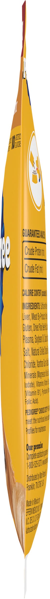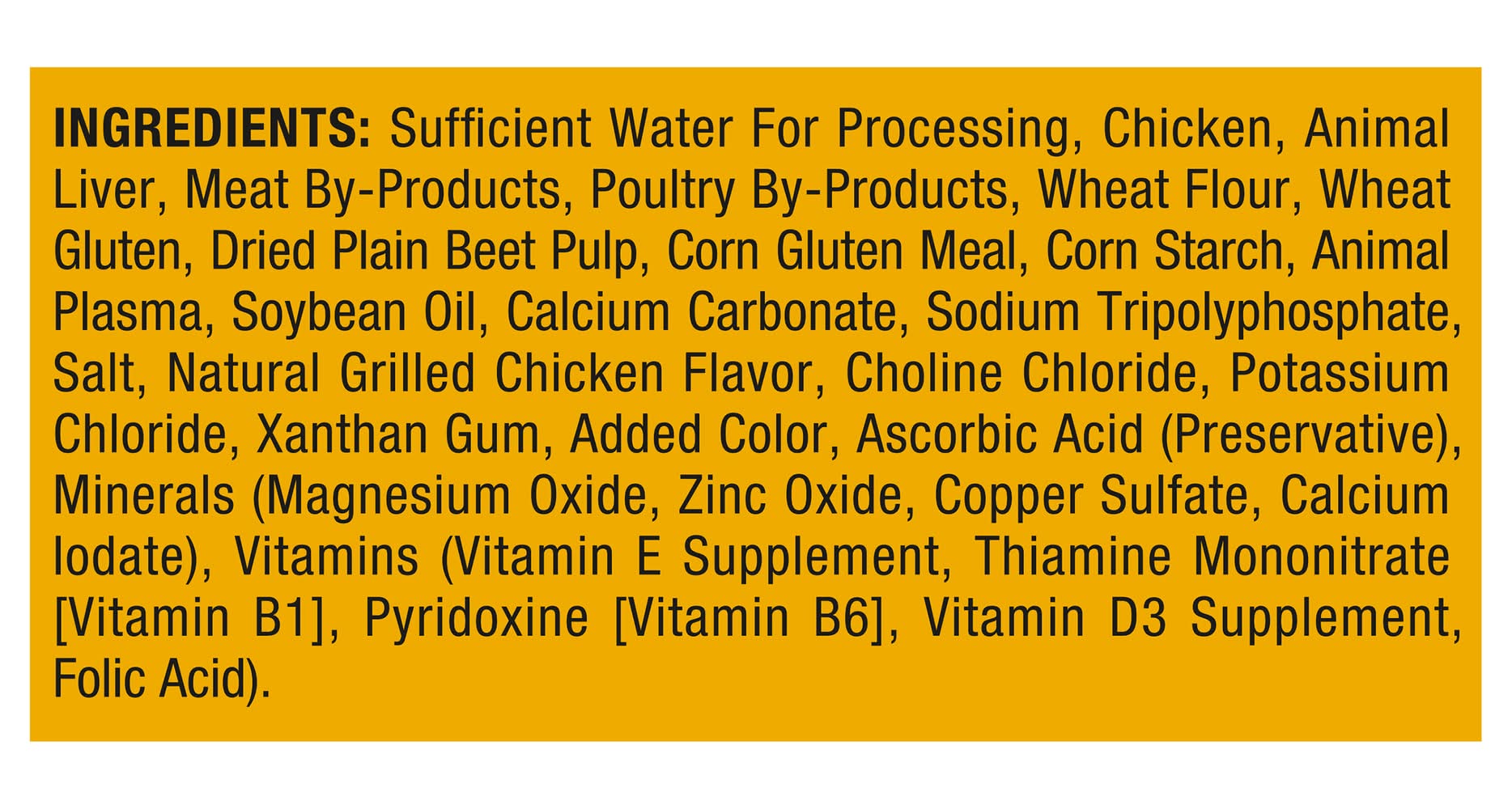 Ingredients: Sufficient Water for Processing, Chicken, Animal Liver, Meat By-Products, Poultry By-Products, Wheat Flour, Wheat Gluten, Dried Plain Beet Pulp, Corn Gluten Meal, Corn Starch, Animal Plasma, Soybean Oil, Calcium Carbonate, Sodium Tripolyphosphate, Salt, Natural Grilled Chicken Flavor, Choline Chloride, Potassium Chloride, Xanthan Gum, Added Color, Ascorbic Acid (Preservative), Minerals (Magnesium Oxide, Zinc Oxide, Copper Sulfate, Calcium Iodate), Vitamins (Vitamin E Supplement, Thiamine Mononitrate [Vitamin B1], Pyridoxine [Vitamin B6], Vitamin D3 Supplement, Folic Acid) Contains: Wheat, Gluten, Corn, Soybeans