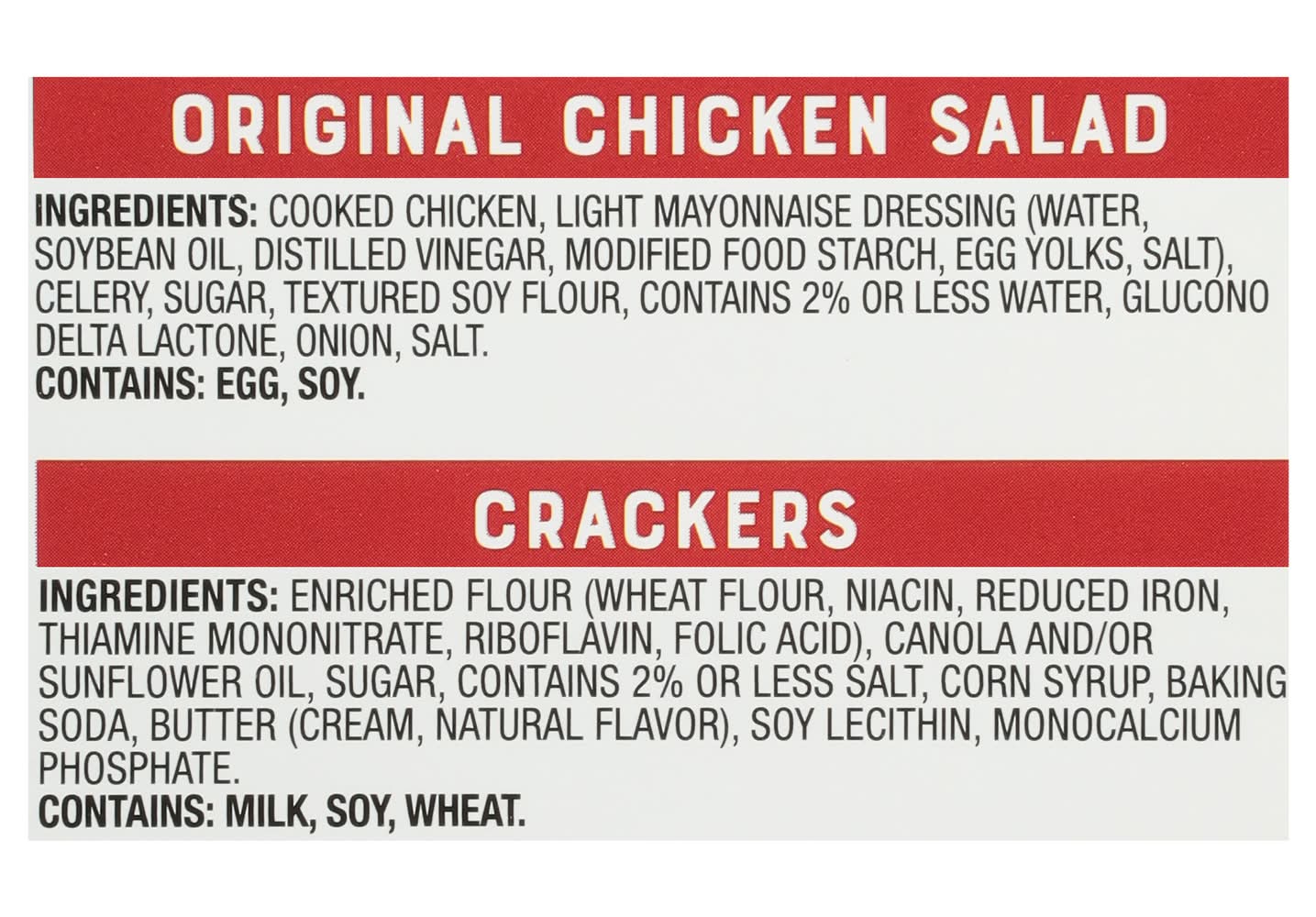 Ingredients: Crackers: Enriched Flour (Wheat Flour, Niacin, Reduced Iron, Thiamine Mononitrate, Riboflavin, Folic Acid), Canola and/or Sunflower Oil, Sugar, Contains 2% or Less Salt, Corn Syrup, Baking Soda, Butter (Cream, Natural Flavor), Soy Lecithin, Monocalcium Phosphate. Contains: Eggs, Soybeans, Celery, Milk, Wheat, Corn