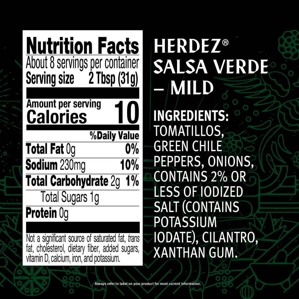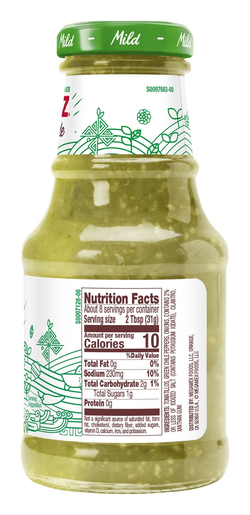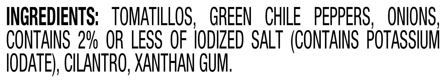 Ingredients: Tomatillos, Green Chile Peppers, Onions, Contains 2% Or Less Of Iodized Salt (Contains Potassium Iodate), Cilantro, Xanthan Gum