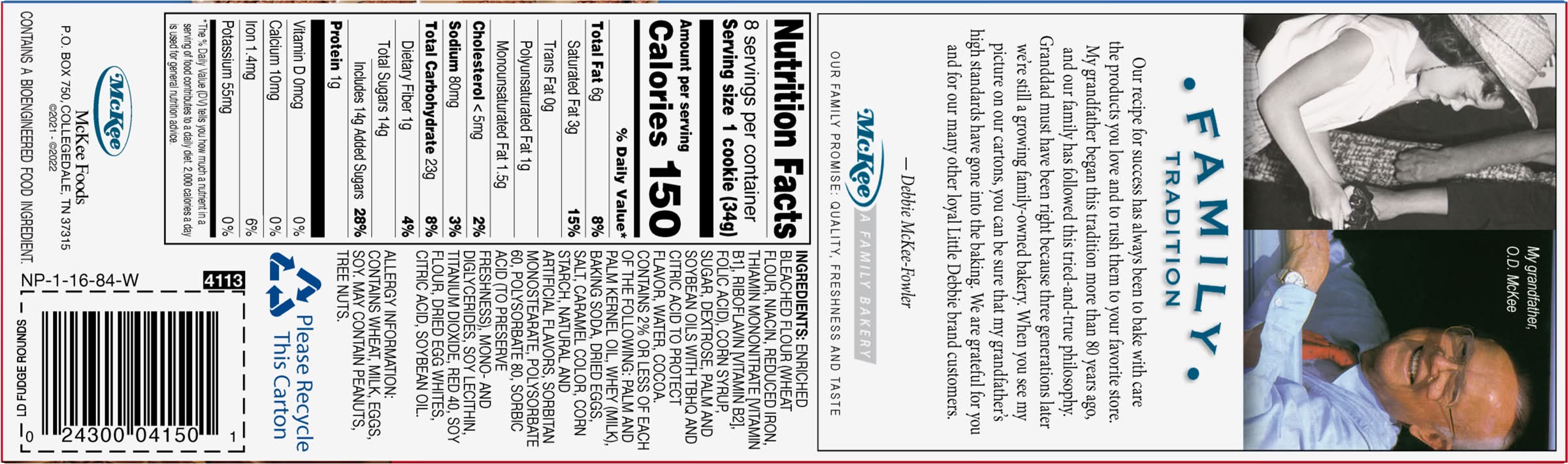 Naturally & artificially flavored. Individually wrapped. A family bakery. Family tradition: our recipe for success has always been to bake with care the products you love and to rush them to your favorite store. Granddad must have been right because three generations later we're still a growing family-owned bakery. When you see my picture on our cartons, you can be sure that my grandfather's high standards have gone into the baking. • Flavor: Chocolate • Size: 9.5 OZ • Mckee foods, p.o. Box 750, Collegedale, Tn, 37315. • Packaging: Reusable