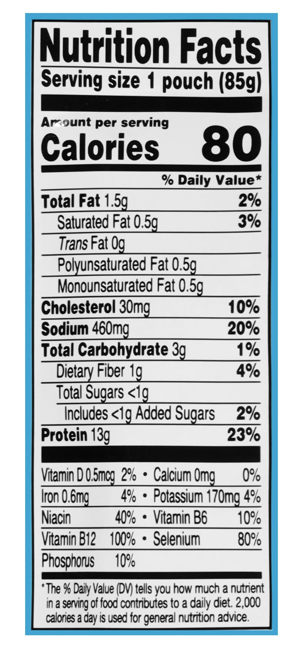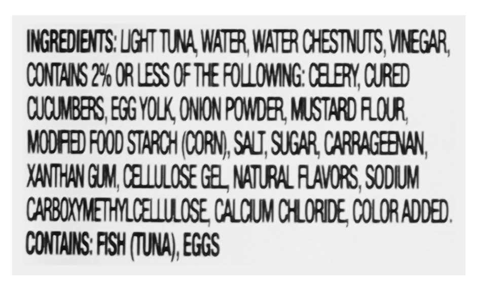 Ingredients: Light Tuna, Water, Water Chestnuts, Vinegar, Contains 2% or Less of the Following: Celery, Cured Cucumbers, Egg Yolk, Onion Powder, Mustard Flour, Modified Food Starch (Corn), Salt, Sugar, Carrageenan, Xanthan Gum, Cellulose Gel, Natural Flavors, Sodium Carboxymethylcellulose, Calcium Chloride, Color Added Contains: Mustard, Celery, Corn, Fish, Eggs