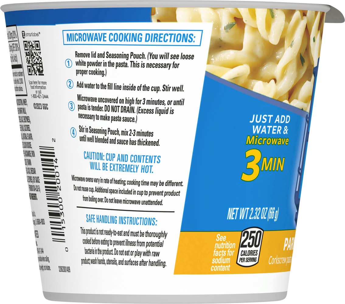 Just add water & microwave 3 min. microwave cooking directions: remove lid and seasoning pouch. (you will see loose white powder in the pasta. this is necessary for proper cooking.) add water to the fill line inside of the cup. stir well. microwave uncovered on high for 3 minutes, or until pasta is tender. do not drain. (excess liquid is necessary to make pasta sauce.) stir in seasoning pouch , mix 2-3 minutes until well blended and sauce has thickened. caution: cup and contents will be extremely hot. microwave ovens vary in rate of heating; cooking time may be different. do not reuse cup. additional space included in cup to prevent product from boiling over. do not leave microwave unattended. try adding in tuna and peas.