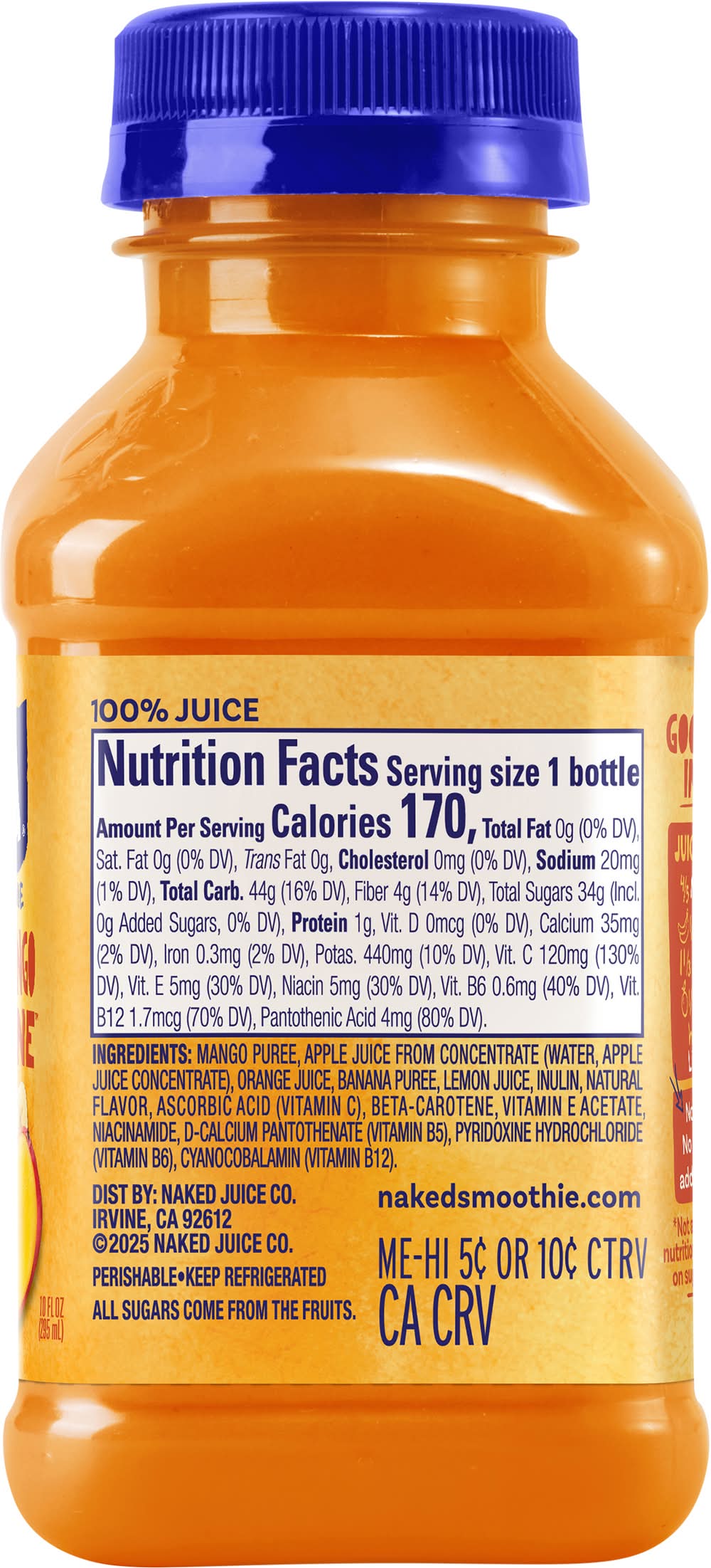 • Flavor: Mighty mango • Size: 10 OZ • Naked Juice Co., Irvine, CA, 92612, Ph: (877) 858-4237 • Packaging: Reusable